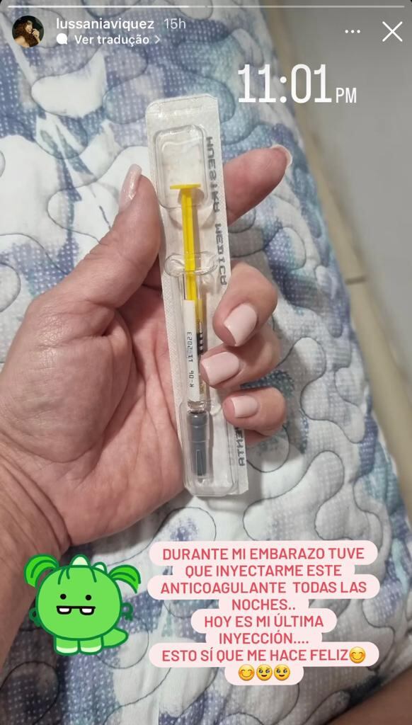 “Durante mi embarazo tuve que inyectarme este anticoagulante todas las noches. Hoy es la última inyección. Esto sí que me hace feliz”, escribió Lu en Instagram con una foto de la última jeringa.