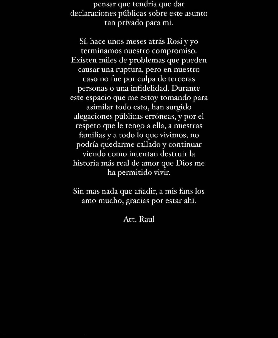 Ante este y otros rumores, Rauw hizo una publicación en su cuenta de Instagram donde escribió: “Durante estos años ustedes han sido parte de los logros profesionales, como también de todos los momentos felices que he vivido en pareja. Jamás me vi en la posición de tan siquiera pensar que tendría que dar declaraciones públicas sobre este asunto tan privado para mí. Hace unos meses atrás Rosi y yo terminamos nuestro compromiso. Existen miles de problemas que pueden causar una ruptura, pero en nuestro caso no fue por culpa de terceras personas o una infidelidad”.