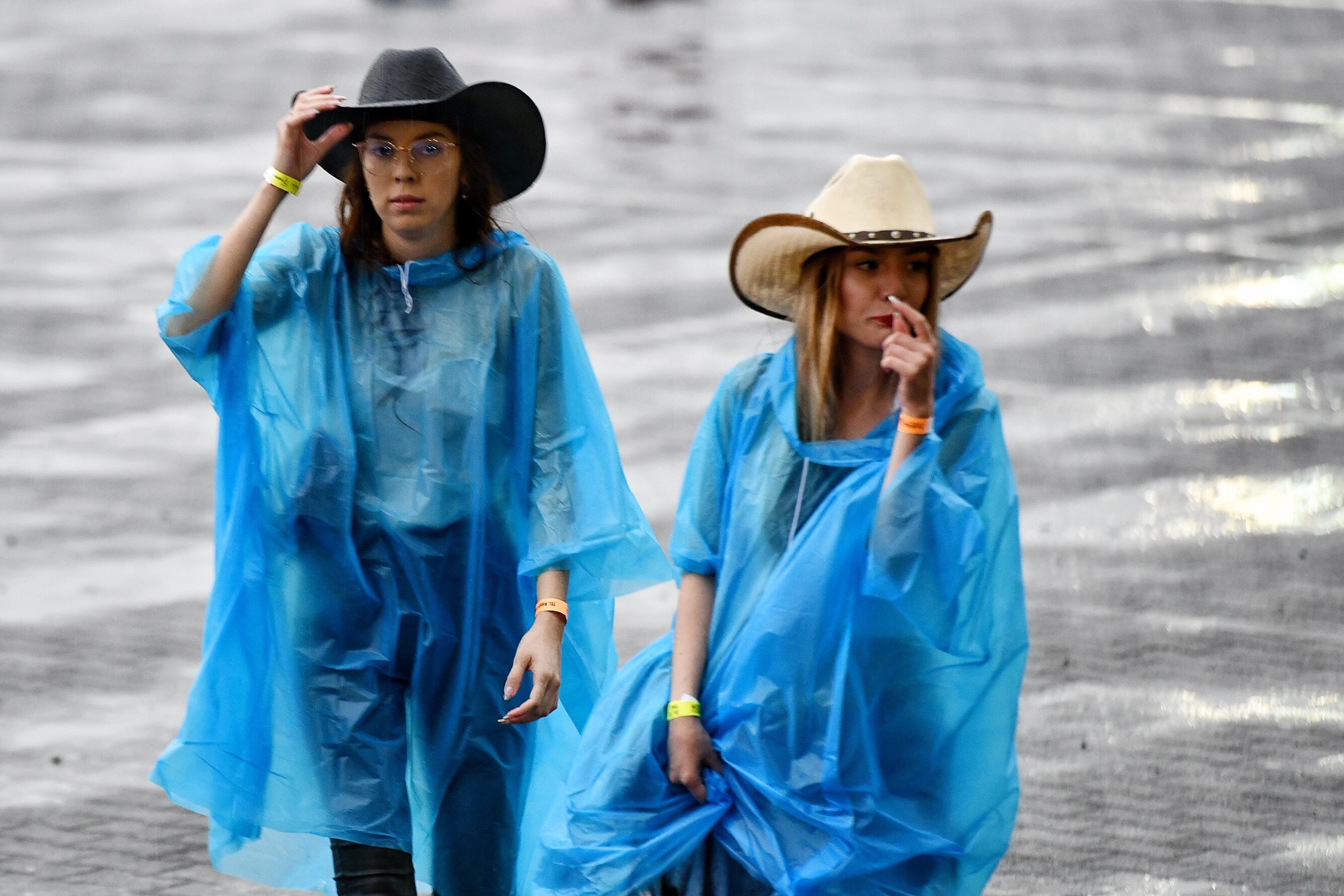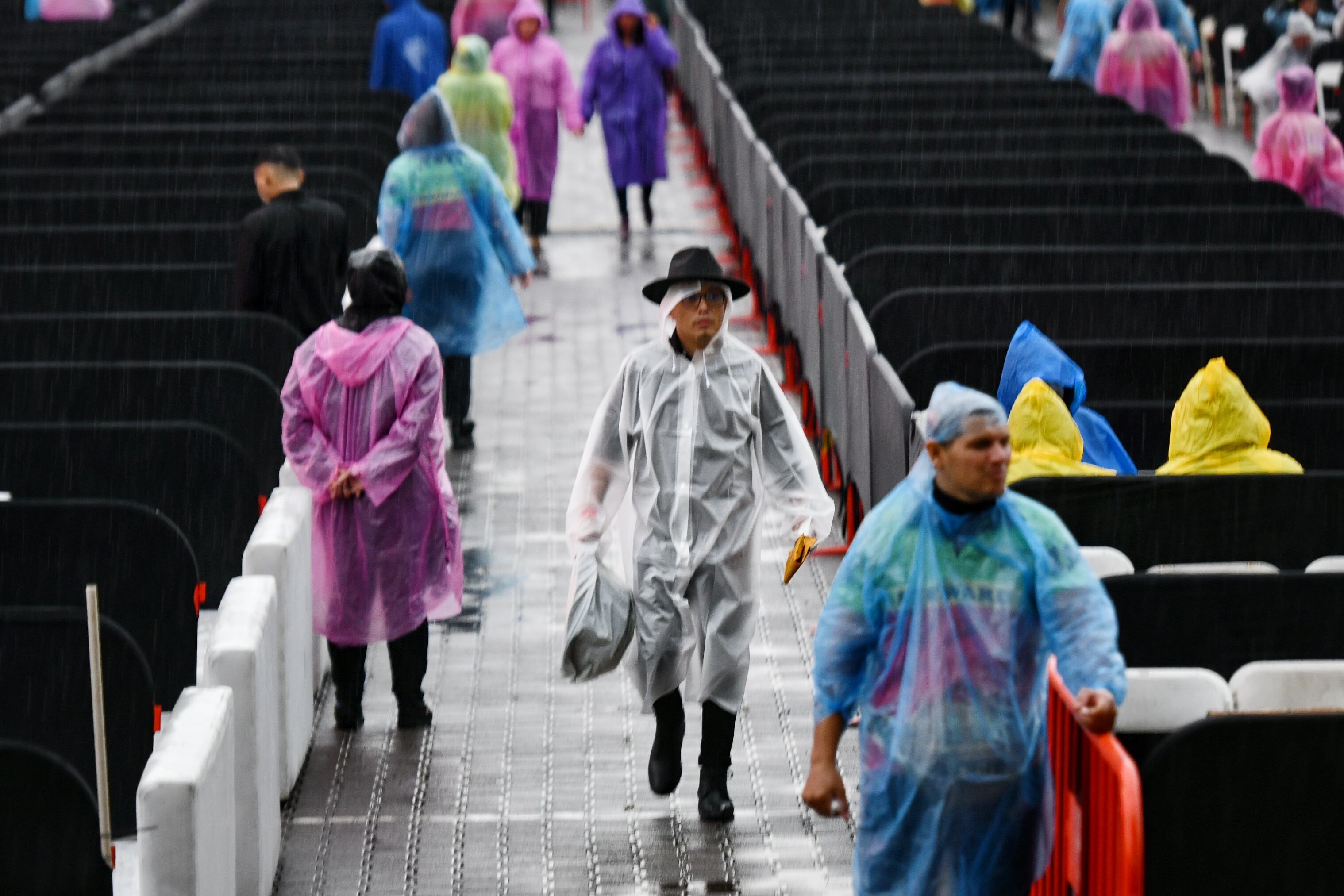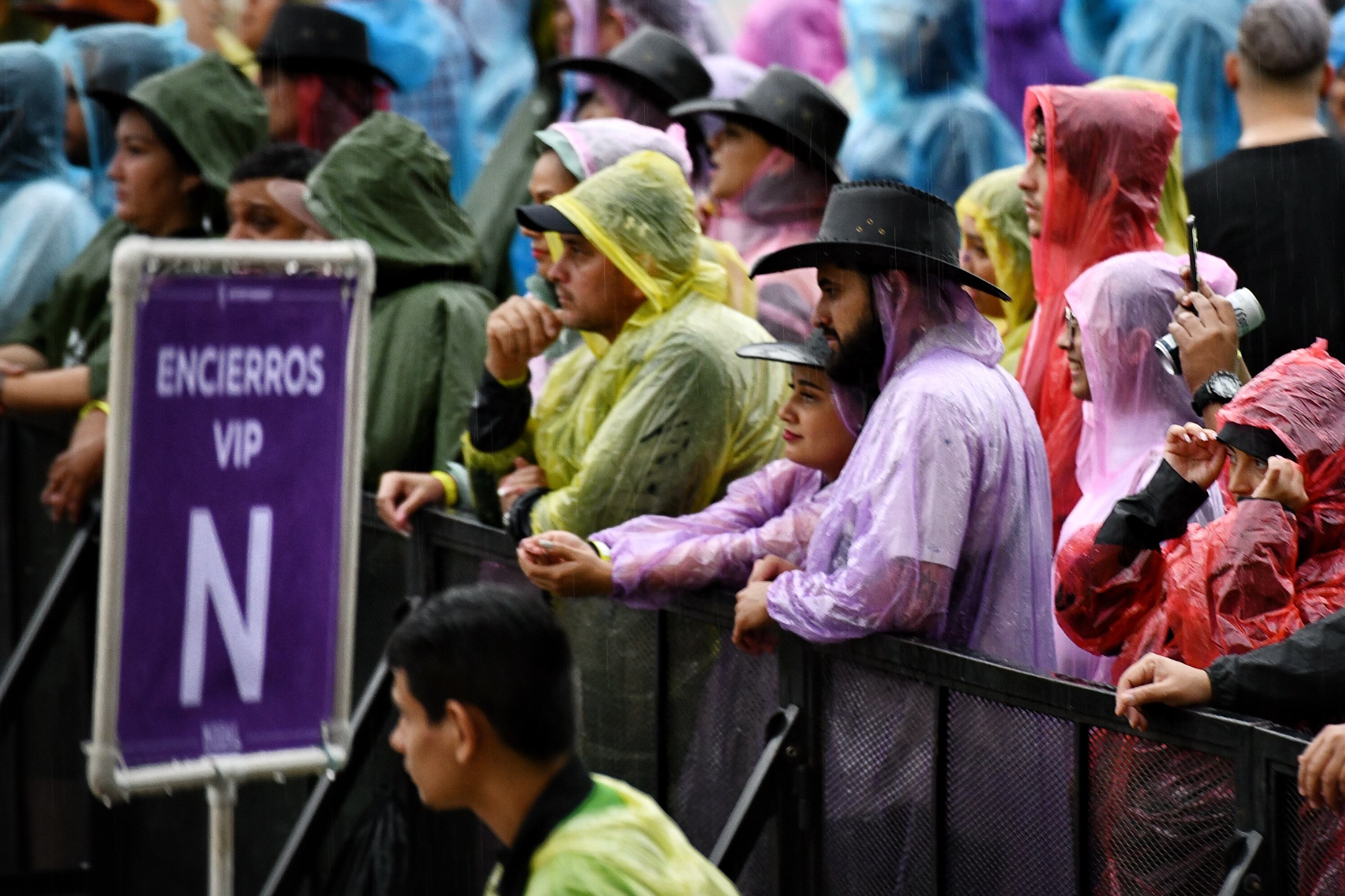 Y aunque la lluvia quiere pasearse en el espectáculo, el público se resignó y decidió cubrir sus sombreros y camisas vaqueras con capas de todos los colores, la vestimenta en común que, por ahora, utilizan los que ya están en el lugar para la presentación.