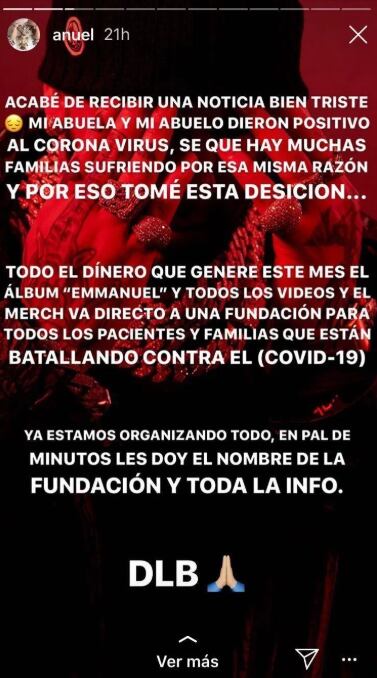 “Acabo de recibir una noticia bien triste. Mi abuela y mi abuelo dieron positivo al coronavirus, sé que hay muchas familias sufriendo por esa misma razón y por eso tomé esta decisión. Todo el dinero que genere este mes el álbum Emmanuel y todos los videos y el merch, va directo a una fundación para todos los pacientes y familias que están batallando contra el COVID-19. Ya estamos organizando todo”, publicó el artista en su historia de Instagram.