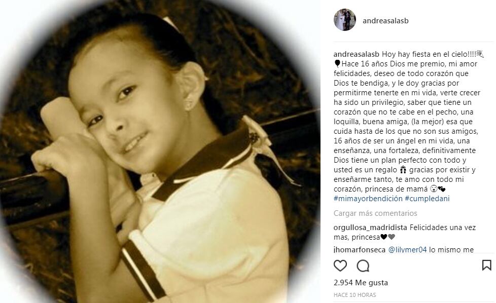 "Definitivamente Dios tiene un plan perfecto con todo y usted es un regalo gracias por existir y enseñarme tanto, te amo con todo mi corazón, princesa de mamá", expresó Salas.