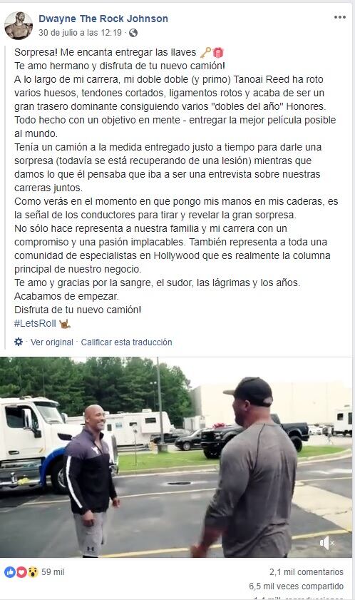 “Te amo, hermano, disfruta de tu nueva camioneta”, escribió Johnson en sus redes sociales. “En el transcurso de mi carrera, mi doble (y primo) Tanoai Reed se ha roto múltiples huesos, los ligamentos, se ha cortado los tendones y acaba de ser nombrado 'Doble del año”, contó la estrella.
