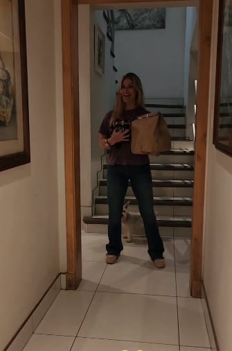En la grabación aparece Vivi recogiendo el paquete de comida que su novio le mandó, lleno de pollito frito de su restaurante Pollo y sus amigos.