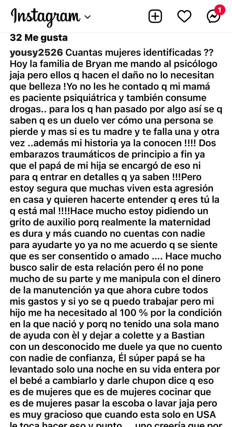 La exmodelo además escribió que la familia de Ganoza la mandó al sicólogo y que ella está distanciada de su mamá porque es “paciente psiquiátrica y también consume drogas” por lo que se siente muy sola.