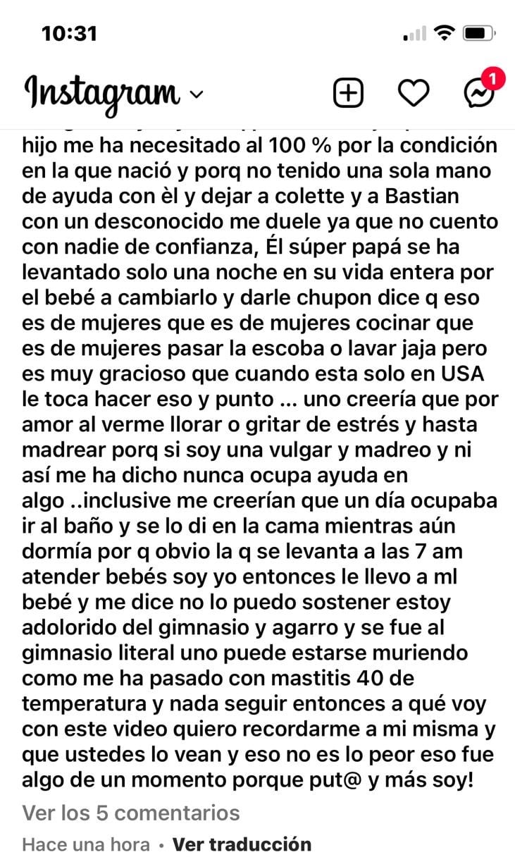 “El superpapá se ha levantado solo una noche en su vida entera por el bebé a cambiarlo y darle chupón, dice que eso es de mujeres, que es de mujeres cocinar, que es de mujeres pasar la escoba o lavar, pero es muy gracioso que cuando está en USA (Estados Unidos) hace eso y punto. Uno creería que por amor al verme llorar o gritar de estrés y hasta madrear, porque sí soy una vulgar y madreo, y ni así me ha dicho nunca ‘ocupa ayuda en algo’”, publicó.