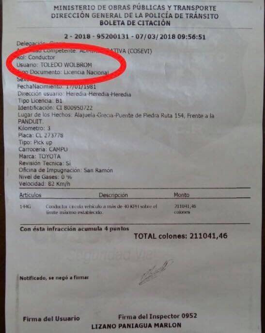 Por haber metido la patota de más en el acelerador, ahora tendrá que pagar 211.041 colones y se le rebajaron cuatro puntos a su licencia de conducir.