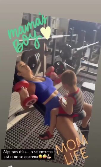 En un video muy tierno que compartió en su Instagram se le ve entrenando, haciendo pesas, pero con un peso extra, el de su hijo Jaden, a quien tiene encima suyo.