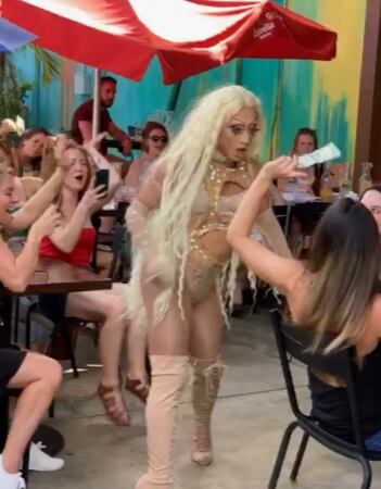 En las imágenes se ve como Naya aparece entre las mesas, que están repletas de clientes, realizando algunas de sus imitaciones de grandes artistas femeninas.