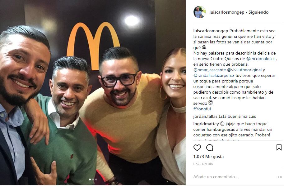 La macha y el galán participaban de un evento de la marca de comida rápida McDonald's, junto a Monge y el director de la revista matutina del canal de La Sabana, Randall Salazar.