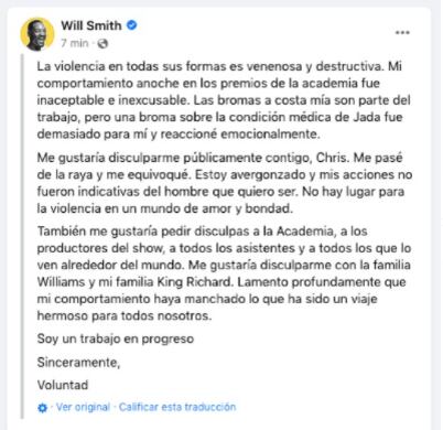 “La violencia en todas sus formas es tóxica y destructiva. Mi comportamiento de anoche en los premios de la Academia fue inaceptable e inexcusable. Las bromas sobre mí forman parte del trabajo, pero una broma sobre la condición médica de Jada fue demasiado para mí y reaccioné emocionalmente”, escribió Smith.