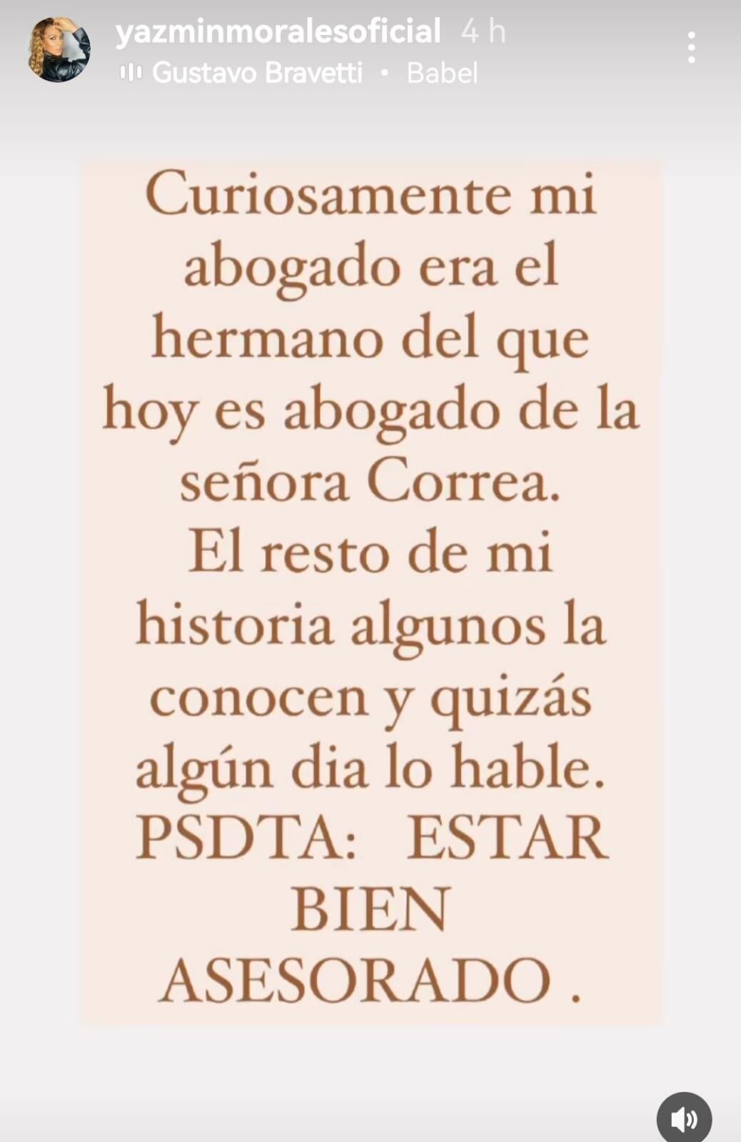 “Curiosamente mi abogado era el hermano del que hoy es abogado de la señora Correa. El resto de mi historia algunos la conocen y quizás algún día lo hable. Pdta: Estar bien asesorado”, escribió en su Instagram.