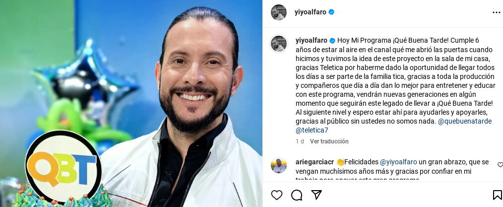 “¡Qué buena tarde! cumple seis años de estar al aire en el canal qué me abrió las puertas cuando hicimos y tuvimos la idea de este proyecto en la sala de mi casa. Gracias Teletica por haberme dado la oportunidad de llegar todos los días a ser parte de la familia tica, gracias a toda la producción y compañeros que día a día dan lo mejor para entretener y educar con este programa, vendrán nuevas generaciones en algún momento que seguirán este legado de llevar a ¡Qué buena tarde! al siguiente nivel y espero estar ahí para ayudarles y apoyarles”, escribió Alfaro en el mensaje por el aniversario del programa.