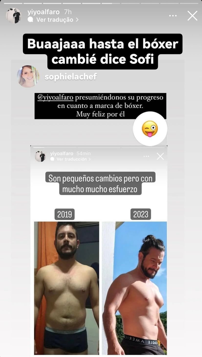 “Yiyo Alfaro presumiéndonos su progreso en cuanto a marca de bóxer. Muy feliz por él”, expresó Sophi al reaccionar a la publicación de Yiyo.