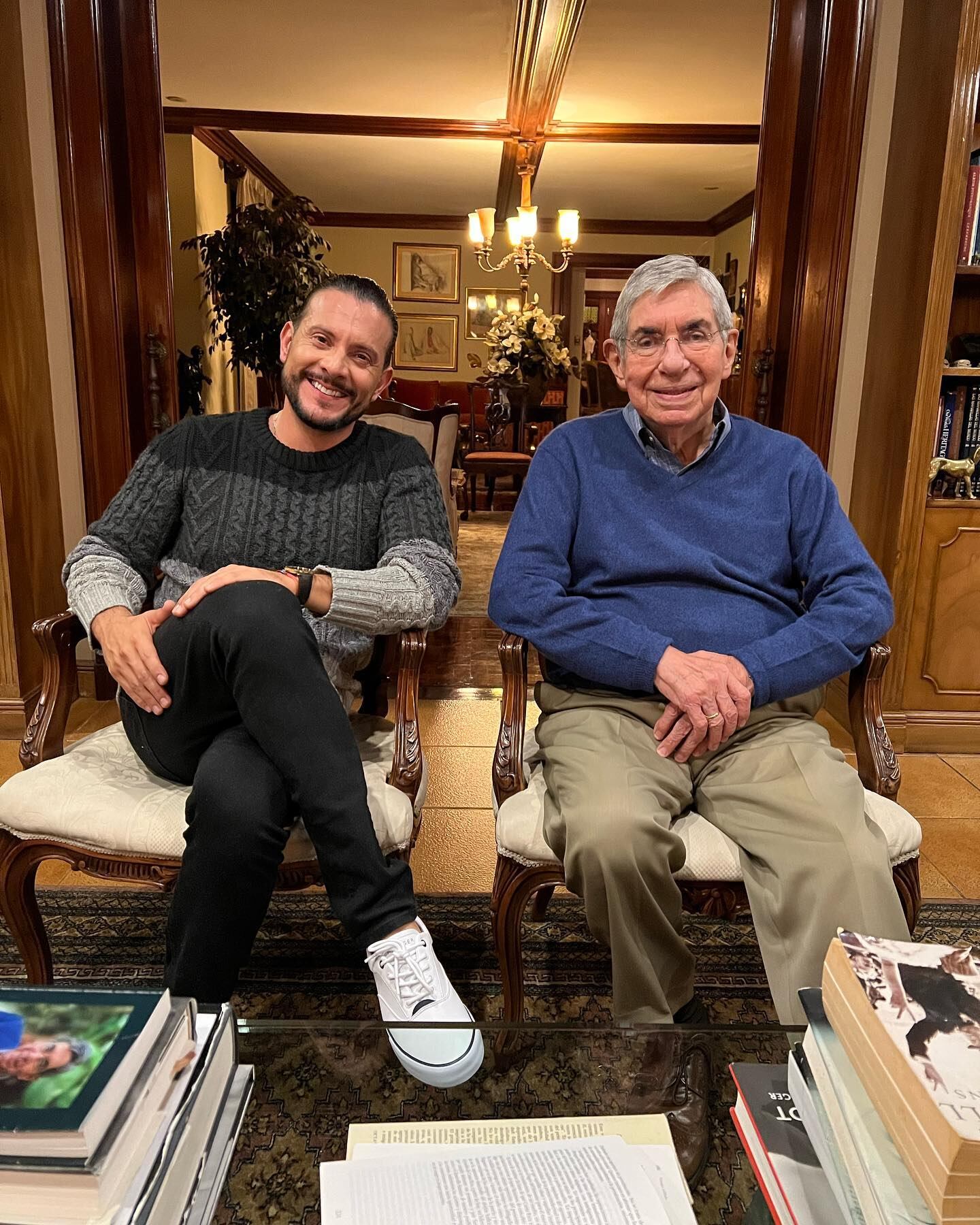 “Una llamada por teléfono donde hablamos sobre nuestra afinidad por el arte, la cultura y la historia, terminó en una charla muy enriquecedora anoche. Gracias don Óscar por la invitación a su casa y permitirme hablar sobre mi fundación Vivo Aquí, la cual tiene como objetivo apoyar a artistas nacionales ( pintores, escultores, escritores, etc,) a desarrollar su talento y no abandonar sus sueños, me llena de satisfacción iniciar este proyecto, sentir que puedo dejar algo positivo en este mundo y que espero algún día, si no estoy, la fundación siga ayudando e impulsando artistas emergentes. Gracias don Óscar por la colección de libros, un regalo increíble”.