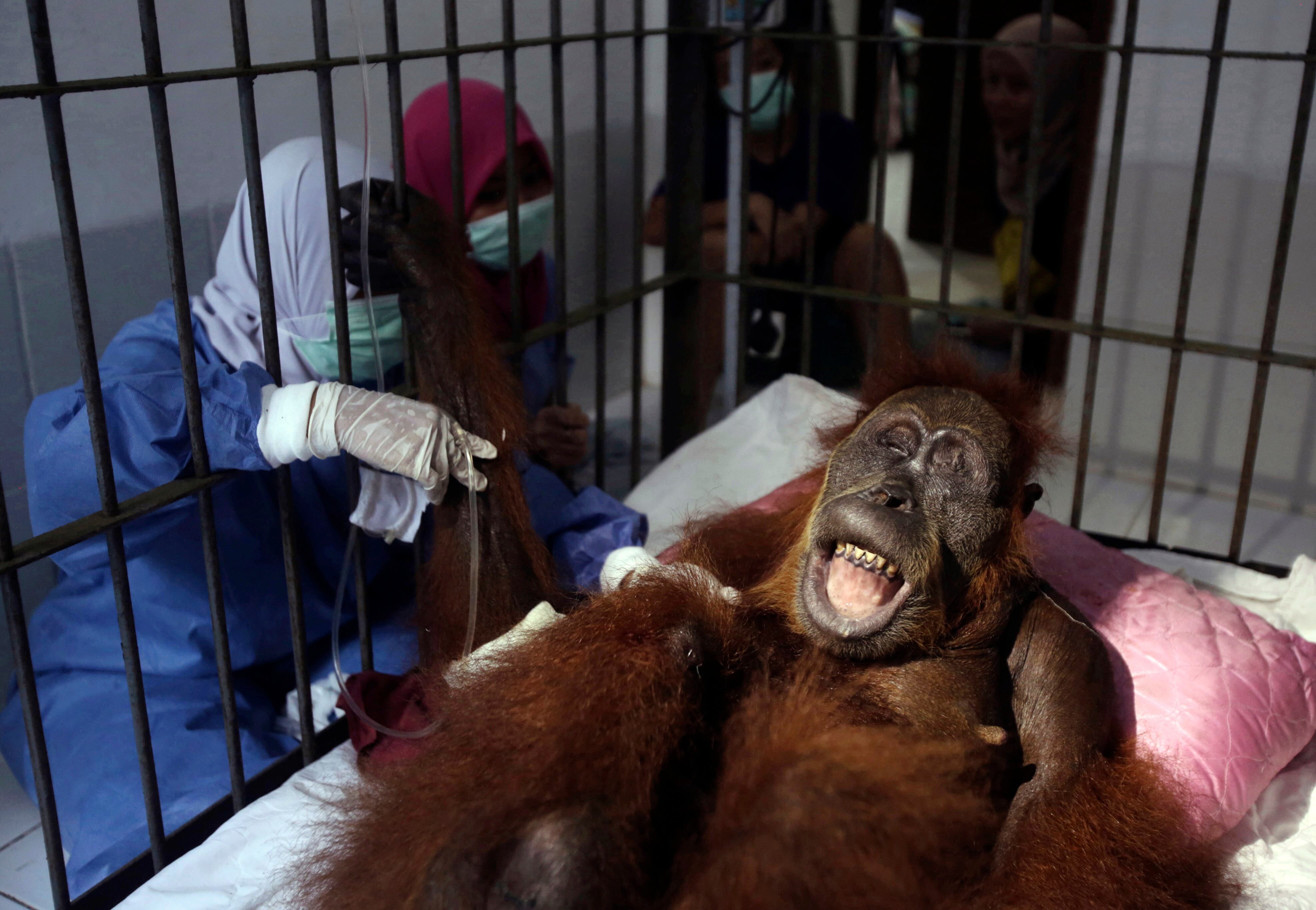 Una orangután quedó ciega después de ser impactada al menos 74 veces con balines de un rifle de aire comprimido en la isla de Sumatra, Indonesia, dijeron un funcionario y una veterinaria.