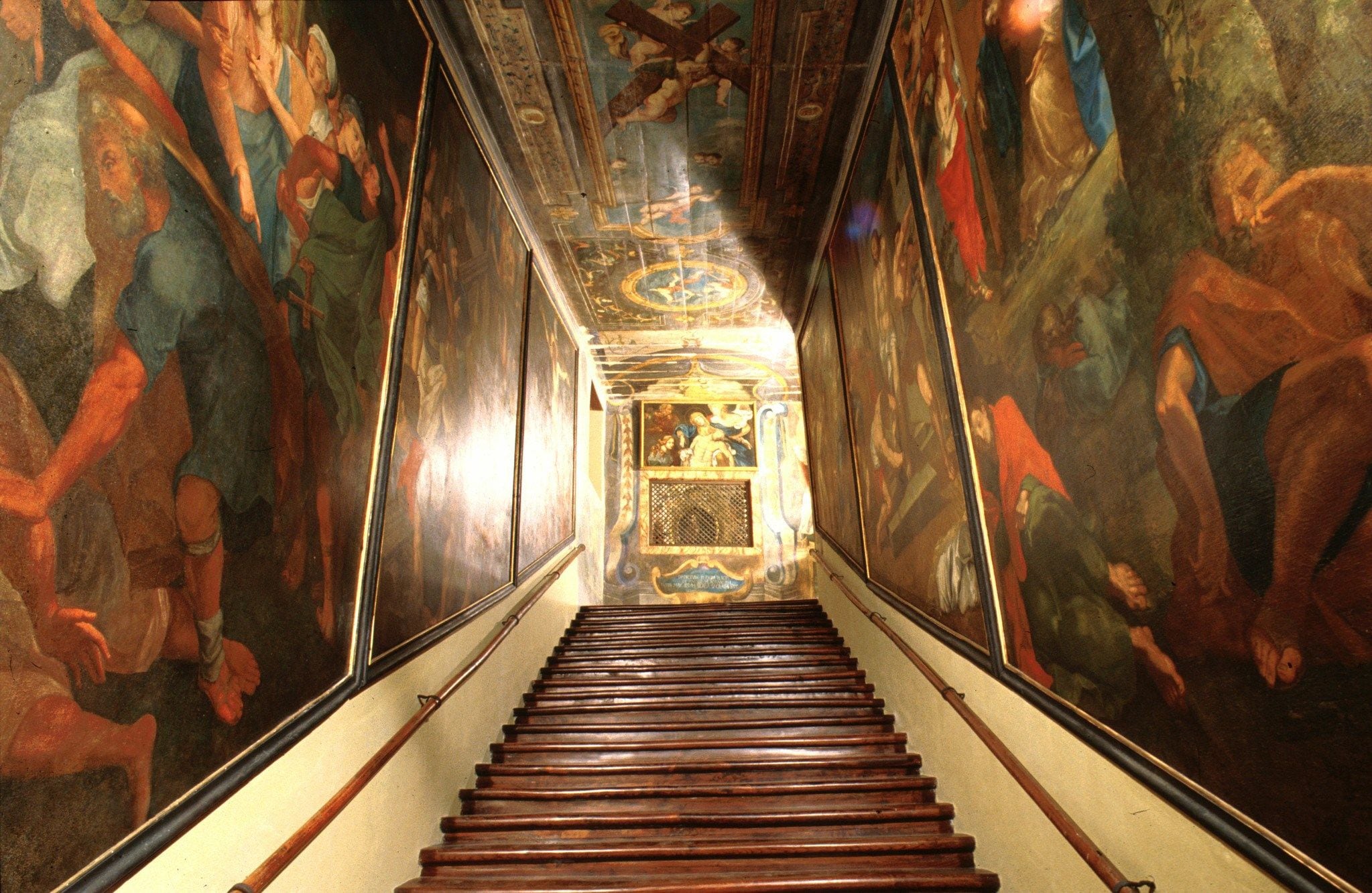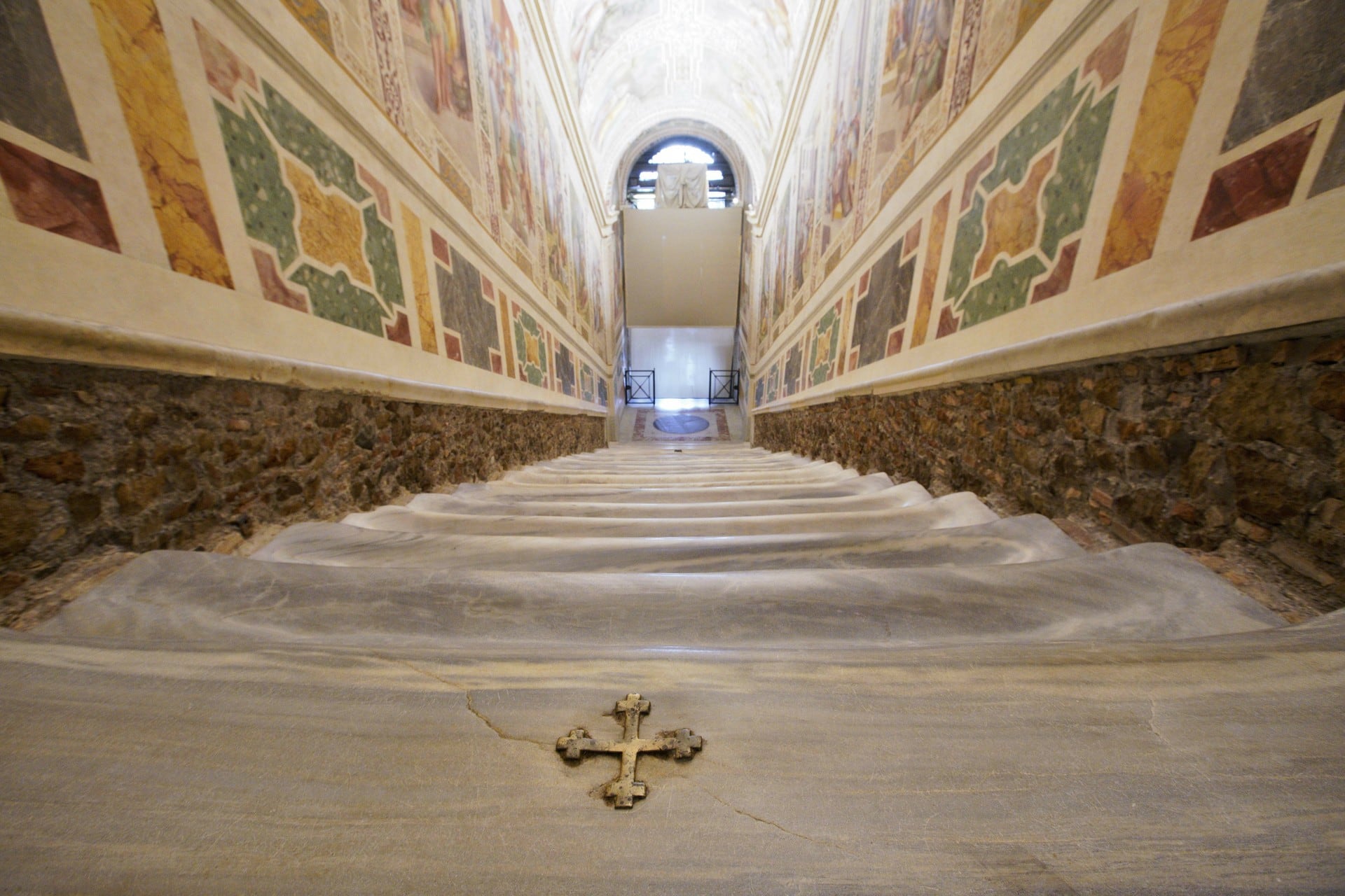 Esta escalera de mármol de 28 escalones fue llevada de Jerusalén a Roma bajo el reinado del emperador Constantino, según una leyenda nunca verificada, antes de ser cubierta en 1723 con madera para protegerla del desgaste ocasionado por los peregrinos.