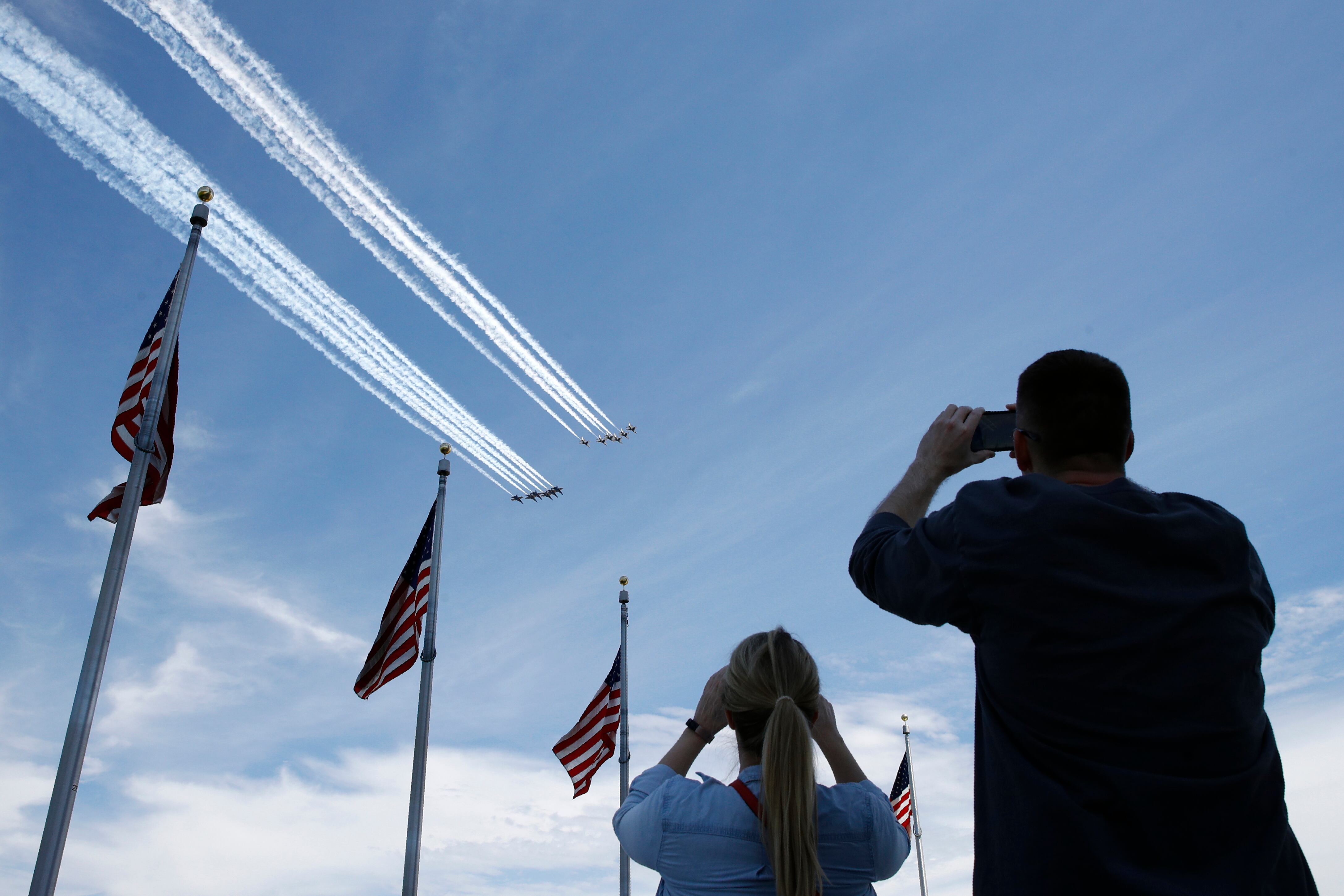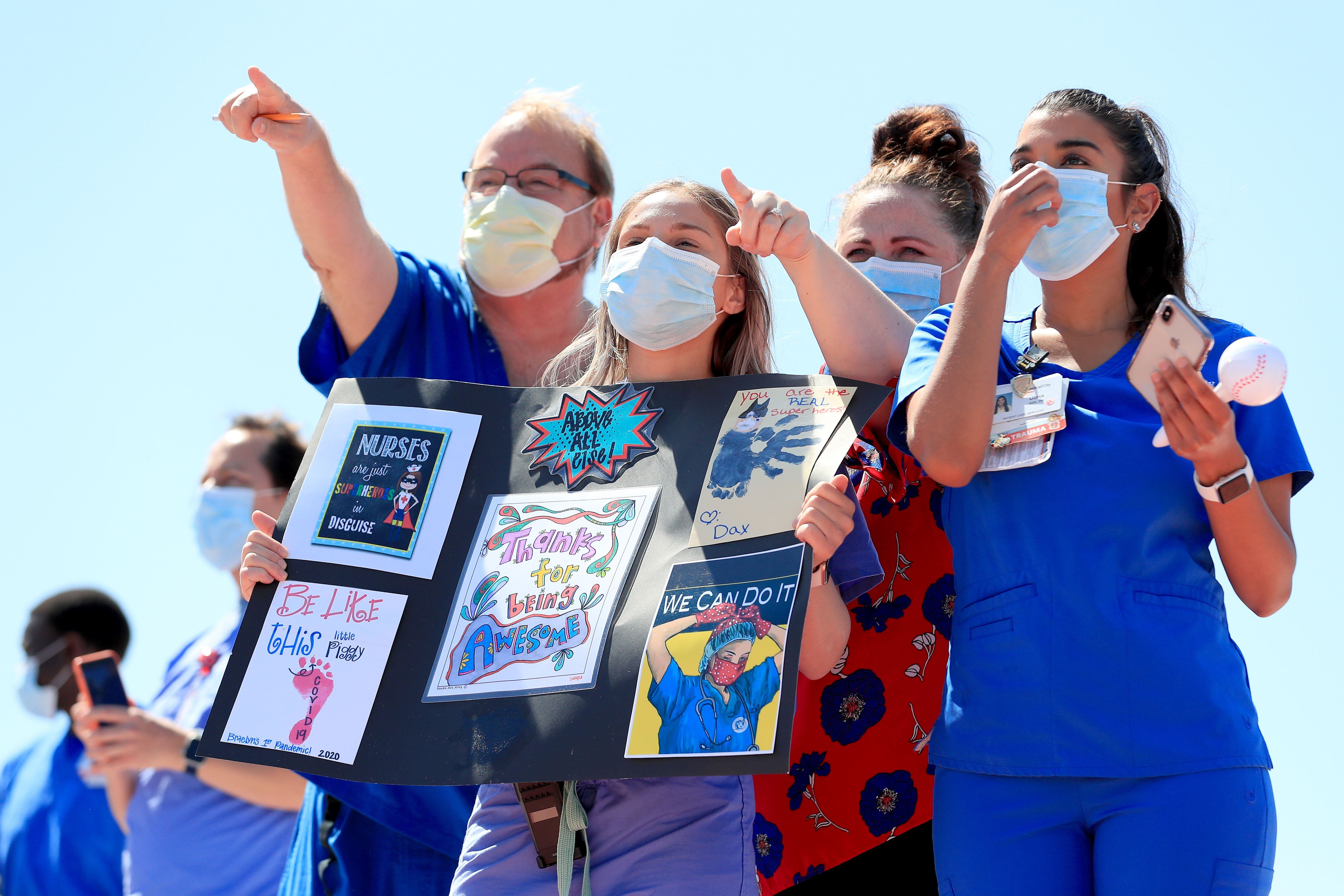 “Orgullosa de ver el saludo a nuestros trabajadores de atención médica y de primera línea con un espectacular paso elevado hoy en Washington. Gracias por esta hermosa muestra de solidaridad”, tuiteó el sábado la primera dama Melania Trump, incluyendo una foto de ella misma observando el sobrevuelo desde afuera de la Casa Blanca.