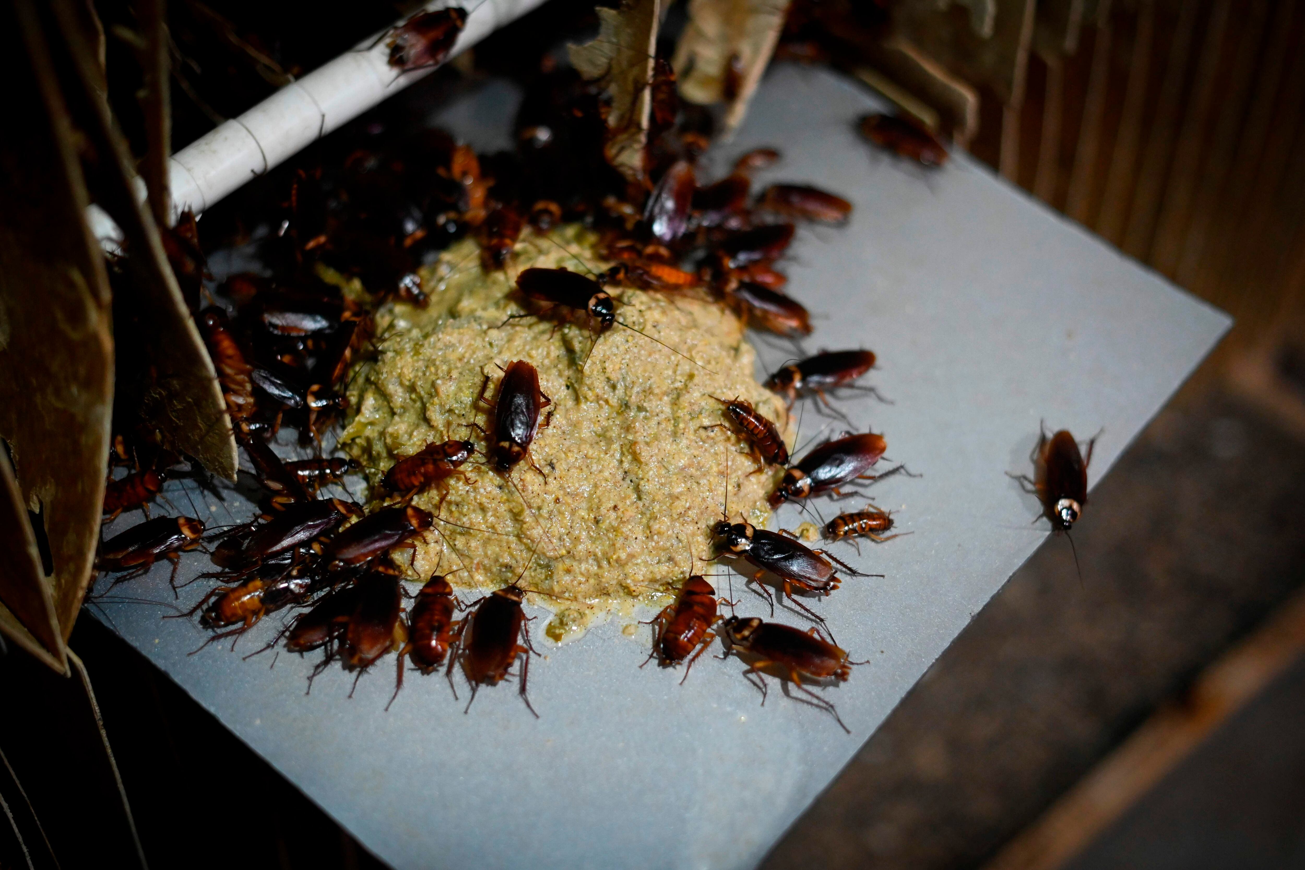 La llegada diaria de comida provoca una locura entre los insectos. Cuando Li Bingcai coloca sobre unas bandejas una mezcla de maíz en polvo, fruta y mondas de verduras, las cucarachas se abalanzan, trepando las unas sobre las otras.