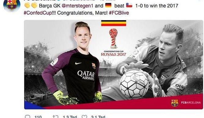 El FC Barcelona felicitó al portero alemán Marc-André ter Stegen por su reciente victoria en la Copa Confederaciones subiendo a Facebook una foto del arquero acompañado con una bandera con los colores de Bélgica, provocando las burlas en varios medios digitales de Alemania.