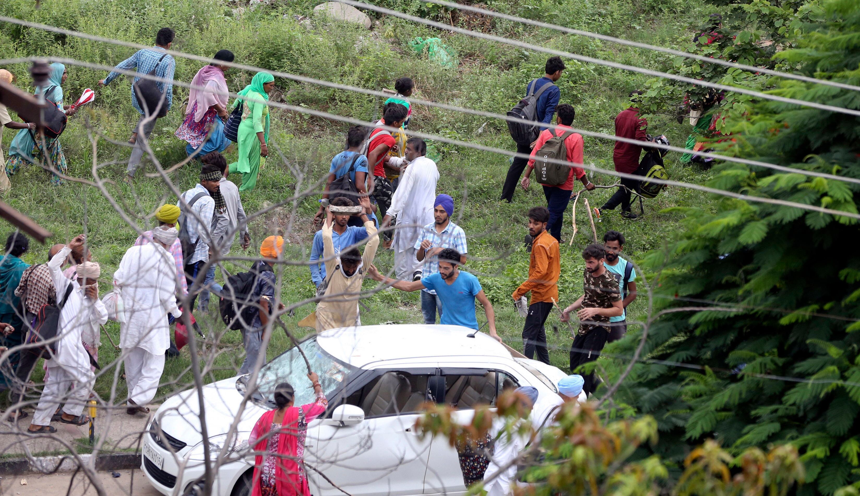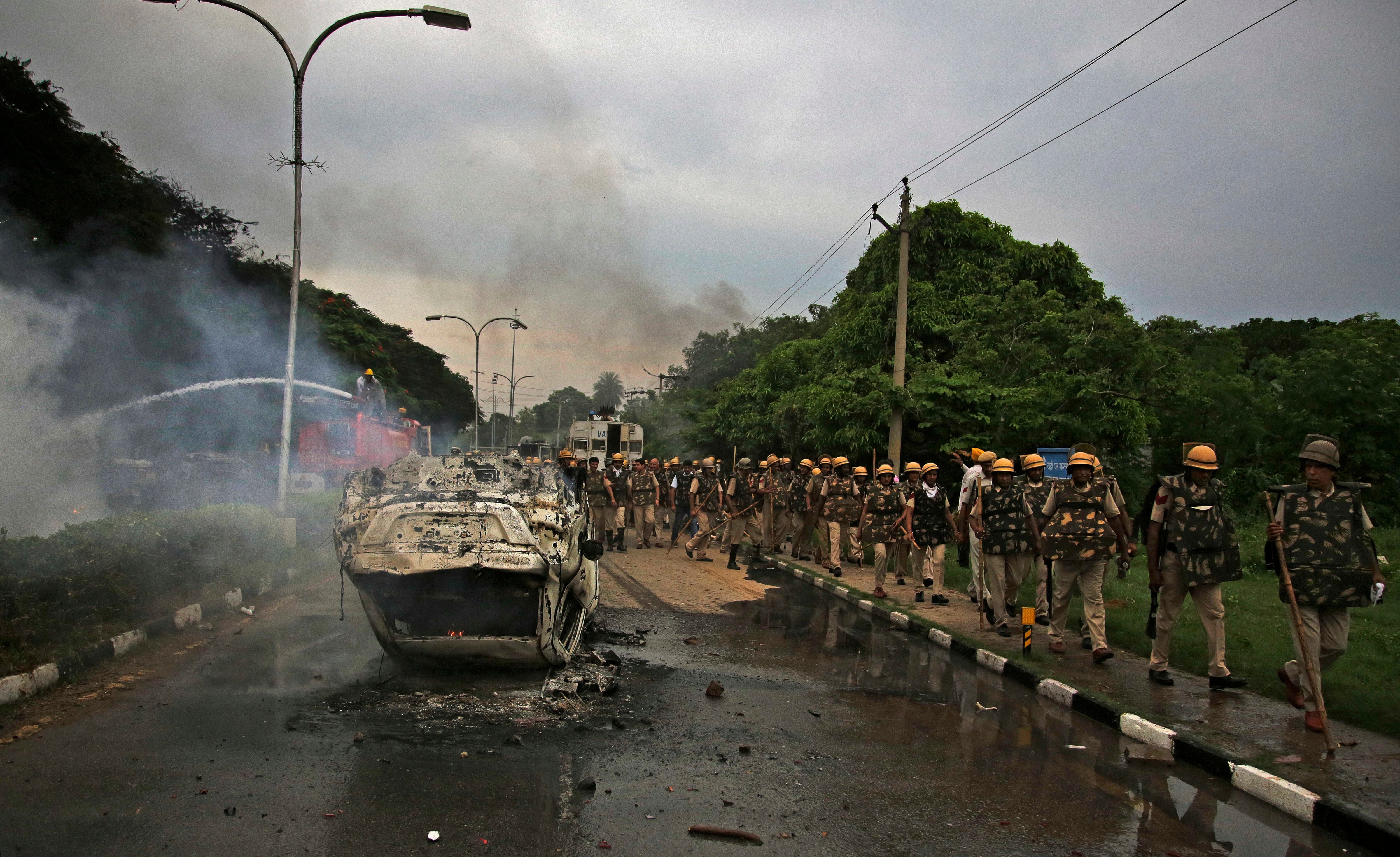 La policía usó cañones hidrantes para tratar de dispersar al montón de gente. Más de 15.000 efectivos paramilitares y de policía, algunos a caballo, ocuparon las calles de la población de Panchkula.
