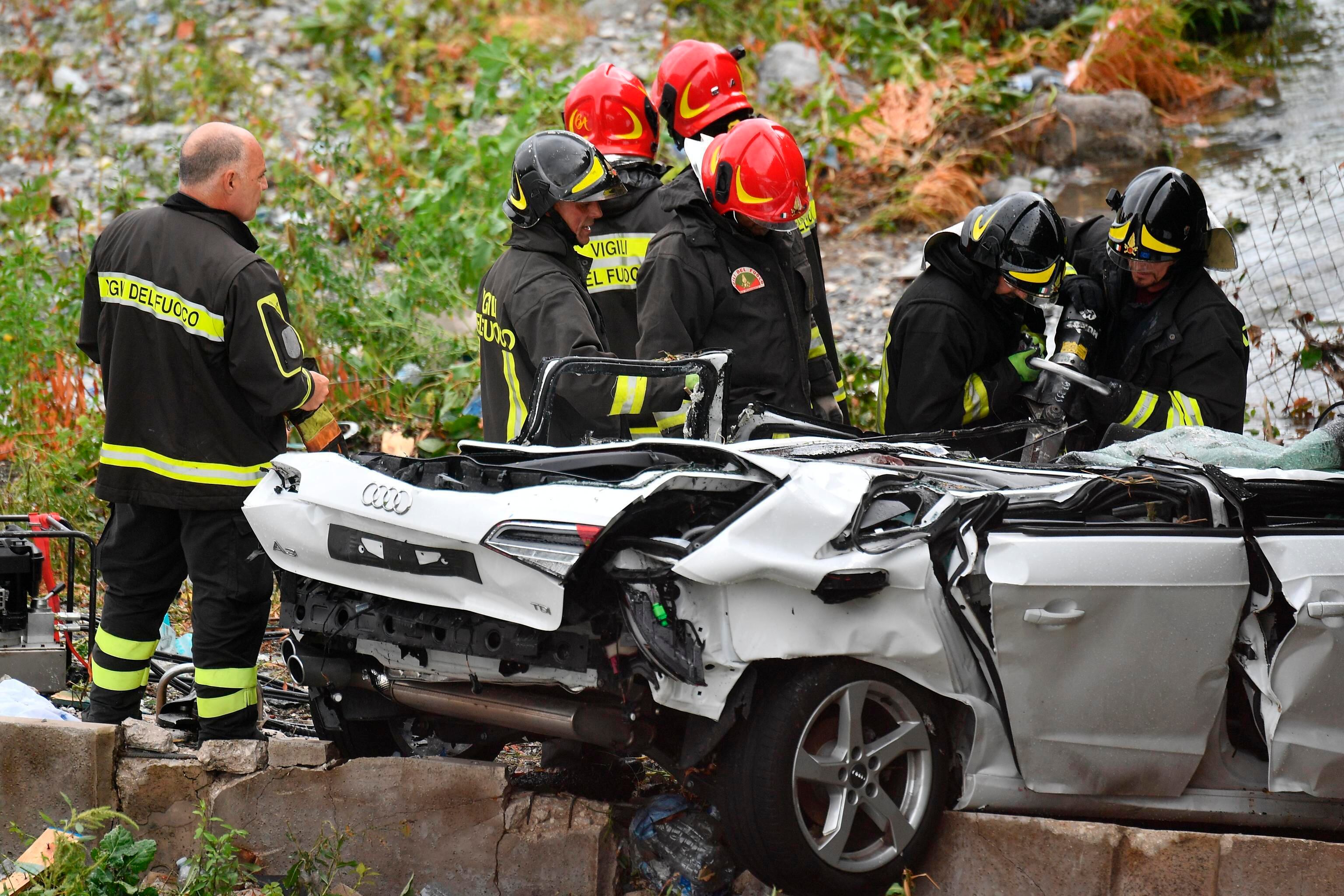 Una parte del puente Morandi yace en medio del agua al lado de los escombros y de los restos de automóviles y camiones destruidos por el derrumbe. La zona donde cayó el viaducto parece como si hubiera sido sacudida por un terremoto.