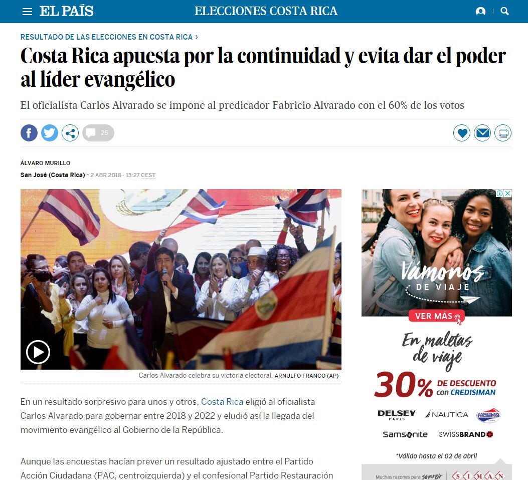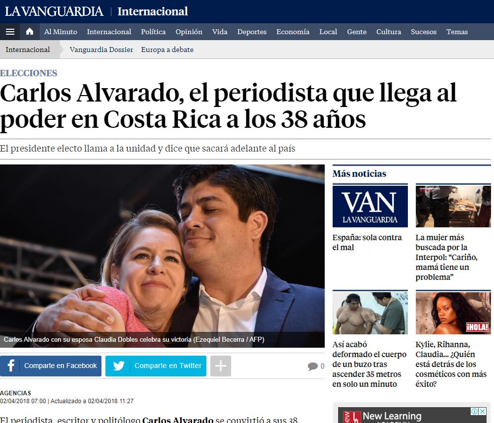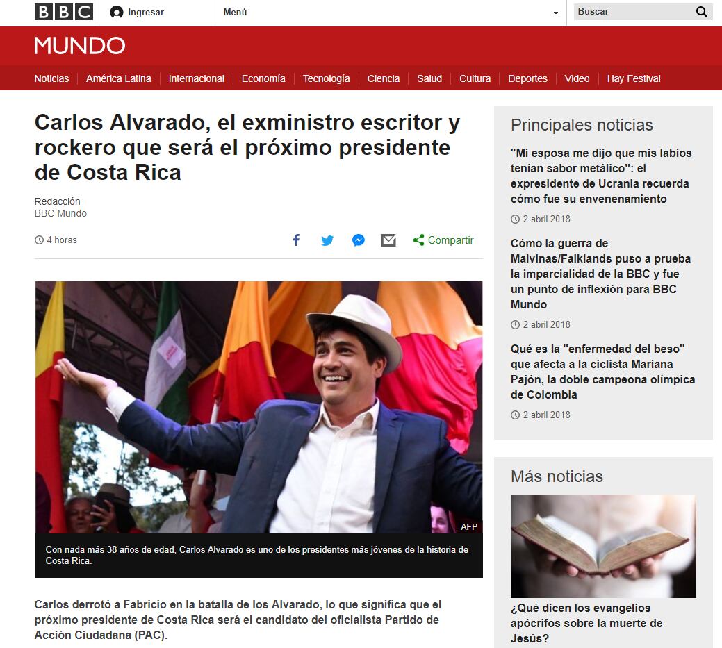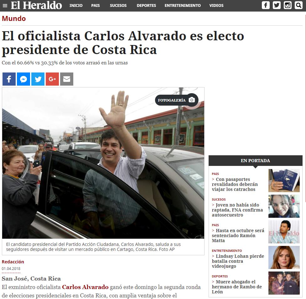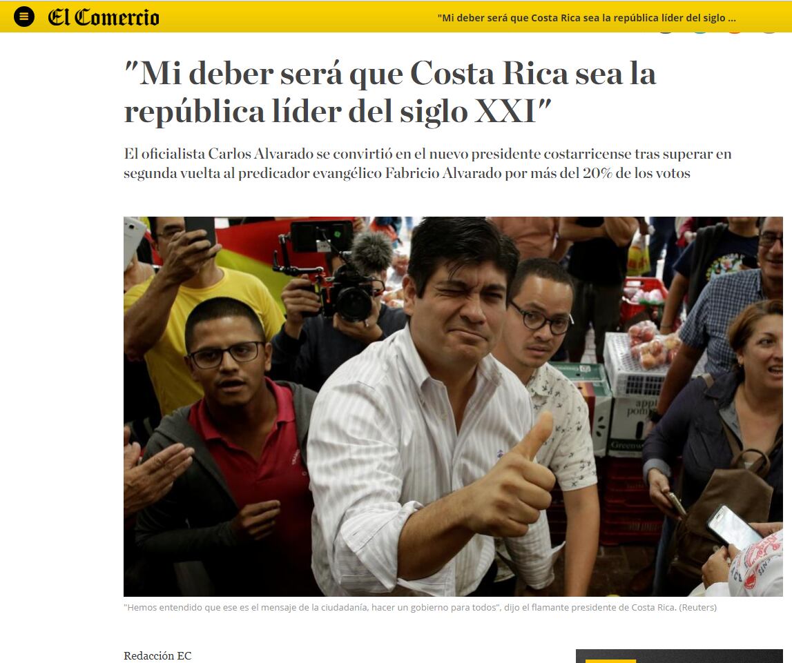La contundente victoria de Carlos Alvarado en las elecciones presidenciales no solo repercutió en Tiquicia. La paliza del 60,67% de los votos emitidos, contra el 39,33% a favor Fabricio Alvarado, de Restauración Nacional (PRN), fue destacada por múltiples medios internacionales.