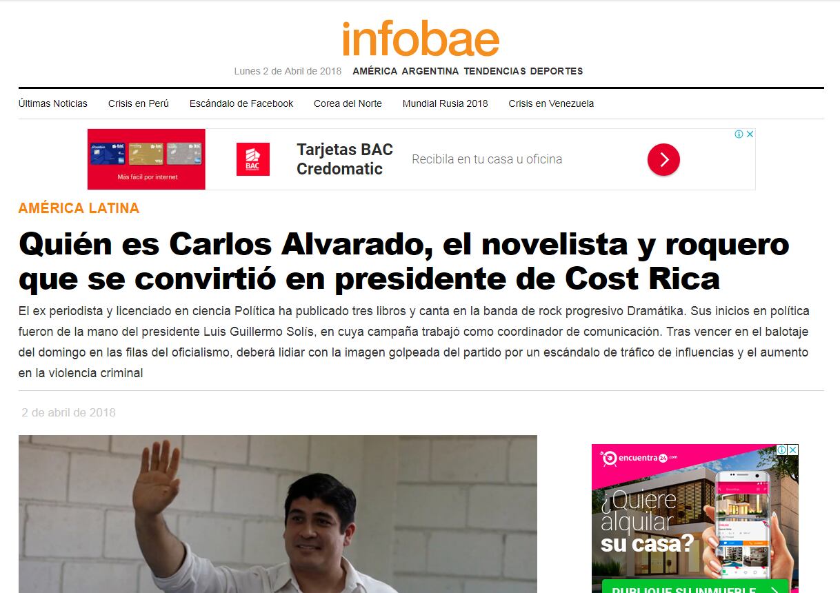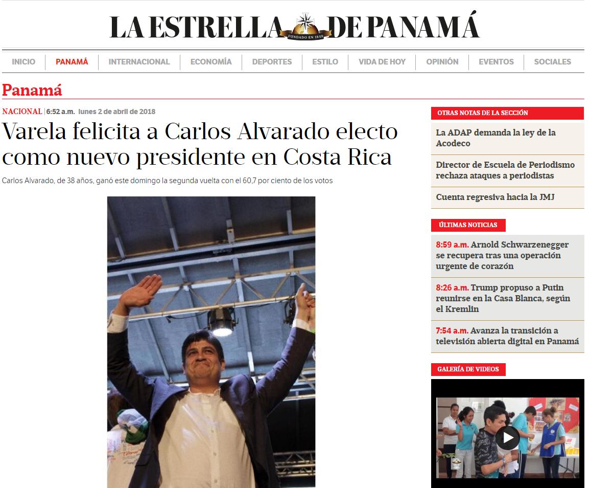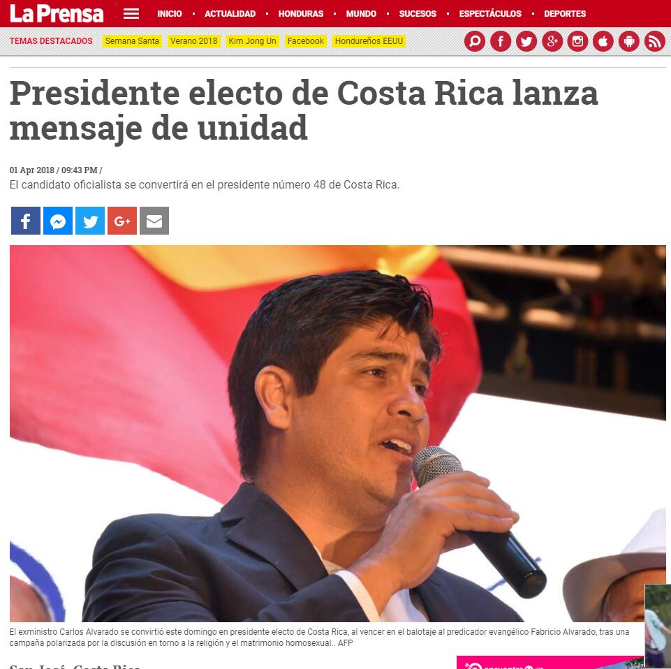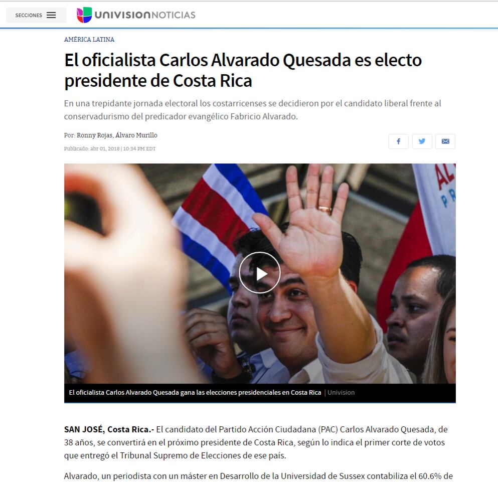 La contundente victoria de Carlos Alvarado en las elecciones presidenciales no solo repercutió en Tiquicia. La paliza del 60,67% de los votos emitidos, contra el 39,33% a favor Fabricio Alvarado, de Restauración Nacional (PRN), fue destacada por múltiples medios internacionales.
