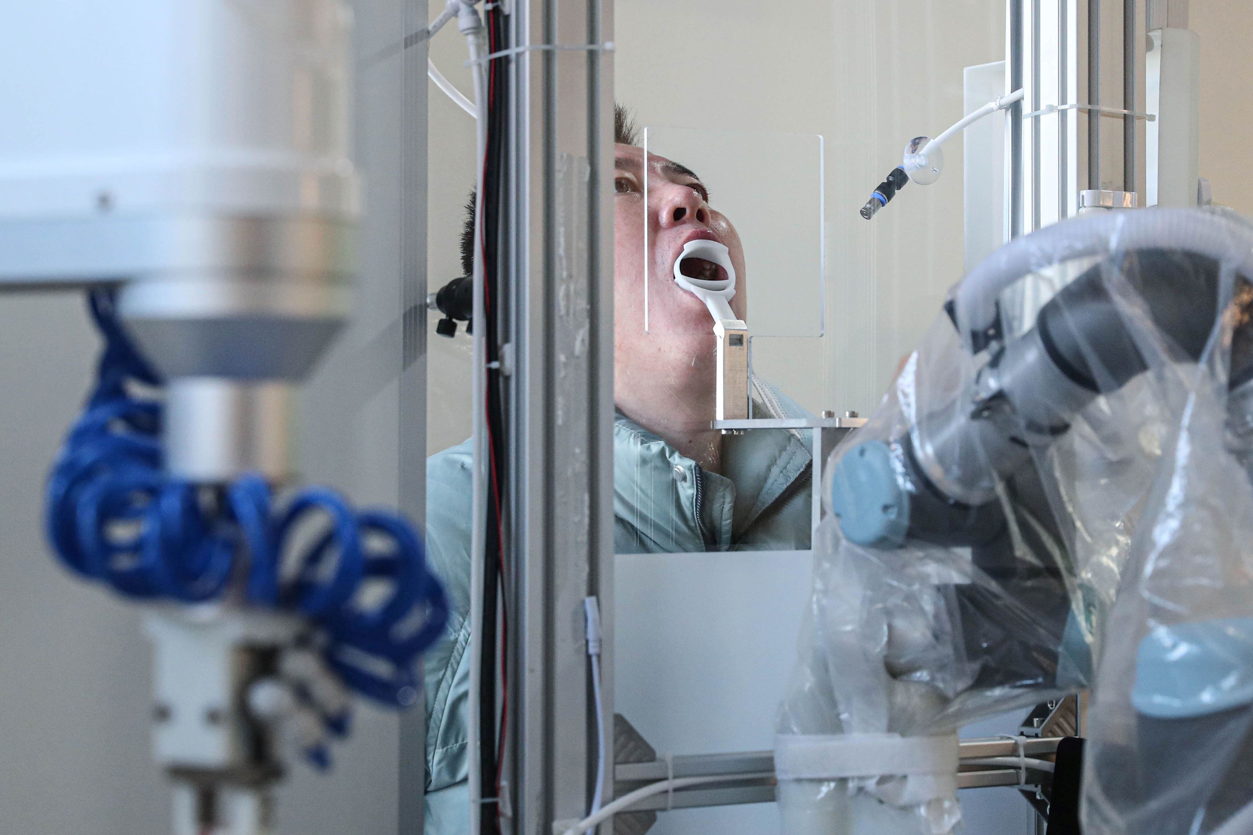 El robot entonces dirige el hisopo hacia la garganta del paciente. Un operador cubierto por un traje de protección completo controla toda la operación de manera remota a través de una cámara instalada en el brazo robótico articulado y una pantalla de control.