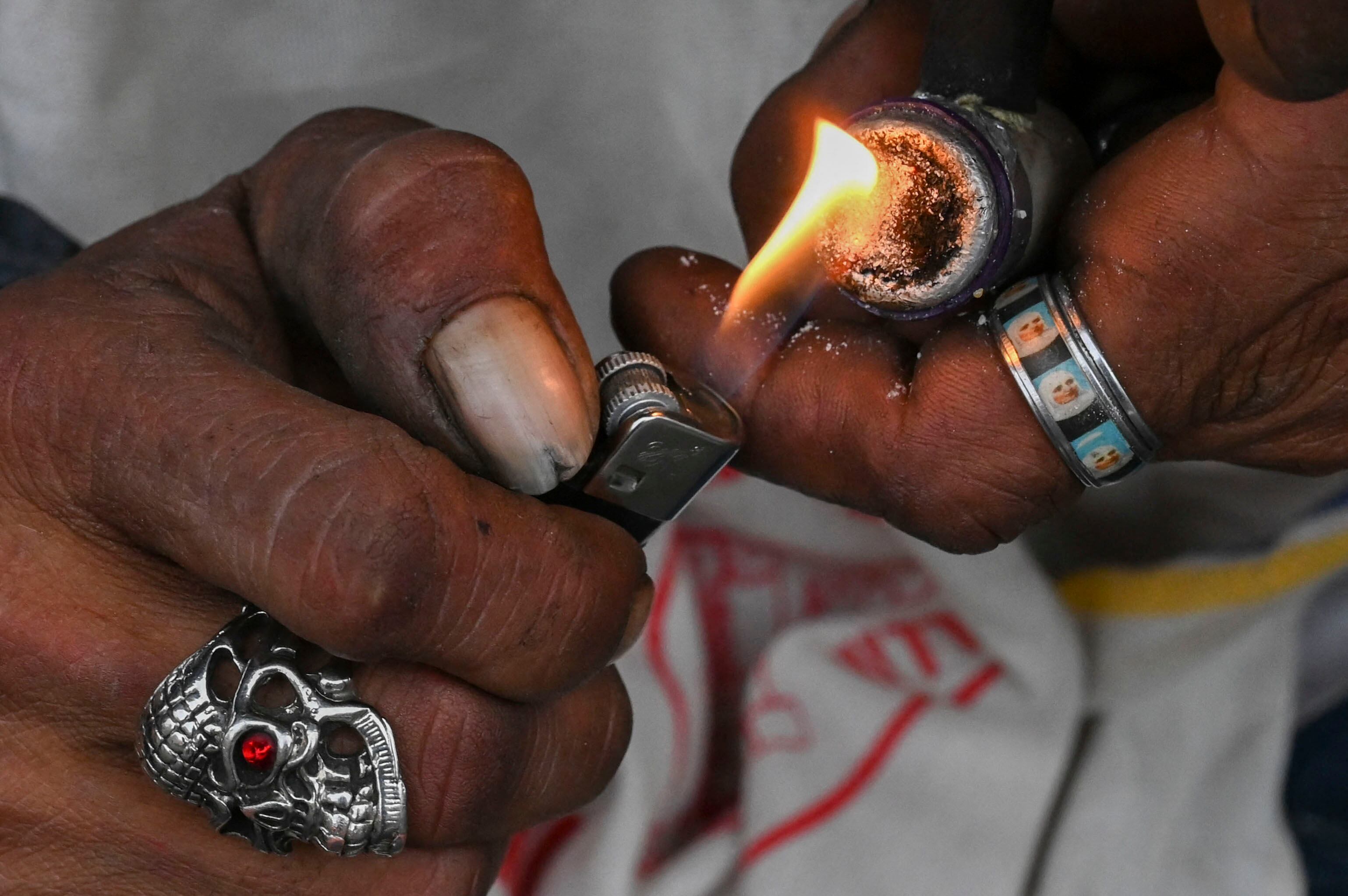 Tembloroso, Morales inhala su dosis de una pipa improvisada con un tubo de plástico y de inmediato sale un olor dulzón. El parque de San Antonio es el punto de encuentro para los consumidores de la droga más barata del mercado local. Peatones y policías miran lo que ocurre.