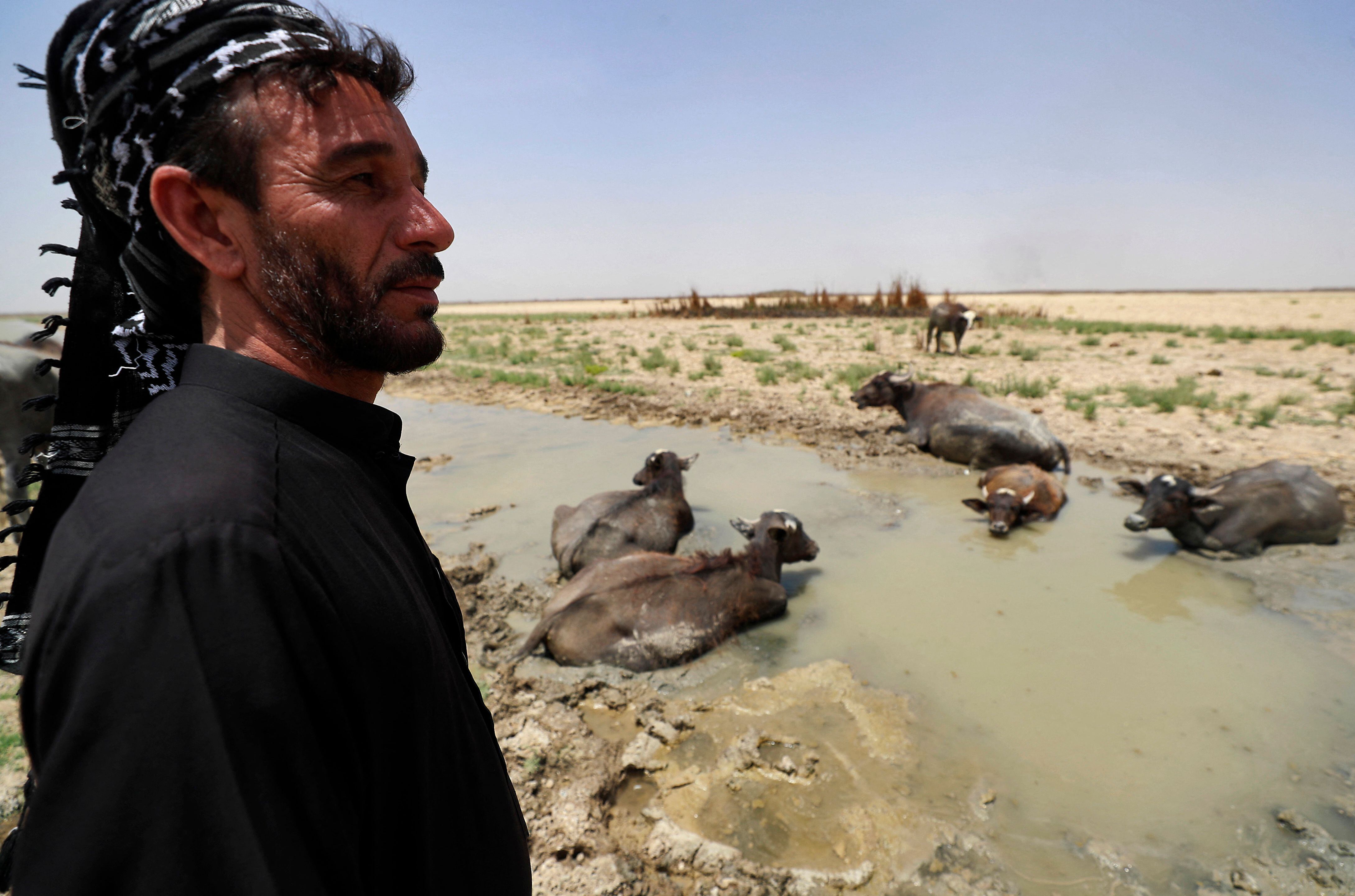 Para alimentar y refrescar a sus búfalos, Hashem Gased debe atravesar 10 kilómetros de tierra calcinada por el sol en el sur de Irak, donde una sequía devasta los legendarios Pantanos de Mesopotamia.