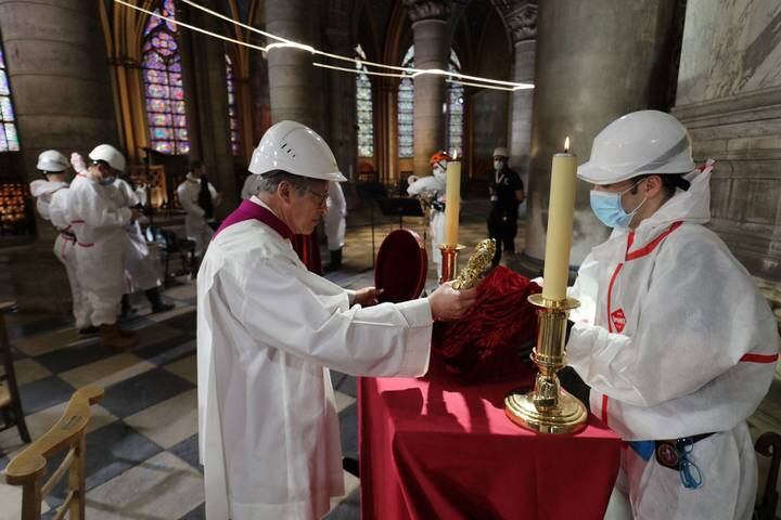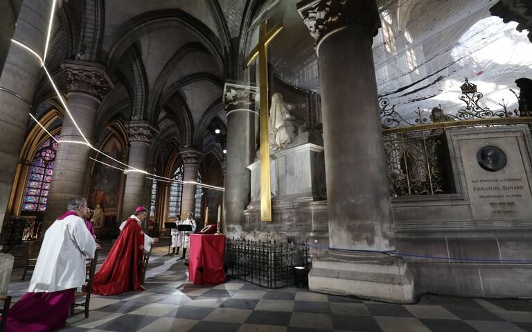 El Viernes Santo, el arzobispo de París, Michel Aupetit, encabezó una ceremonia excepcional, pero pequeña, dentro de la iglesia, al pie de la enorme cruz dorada que se mantiene intacta.