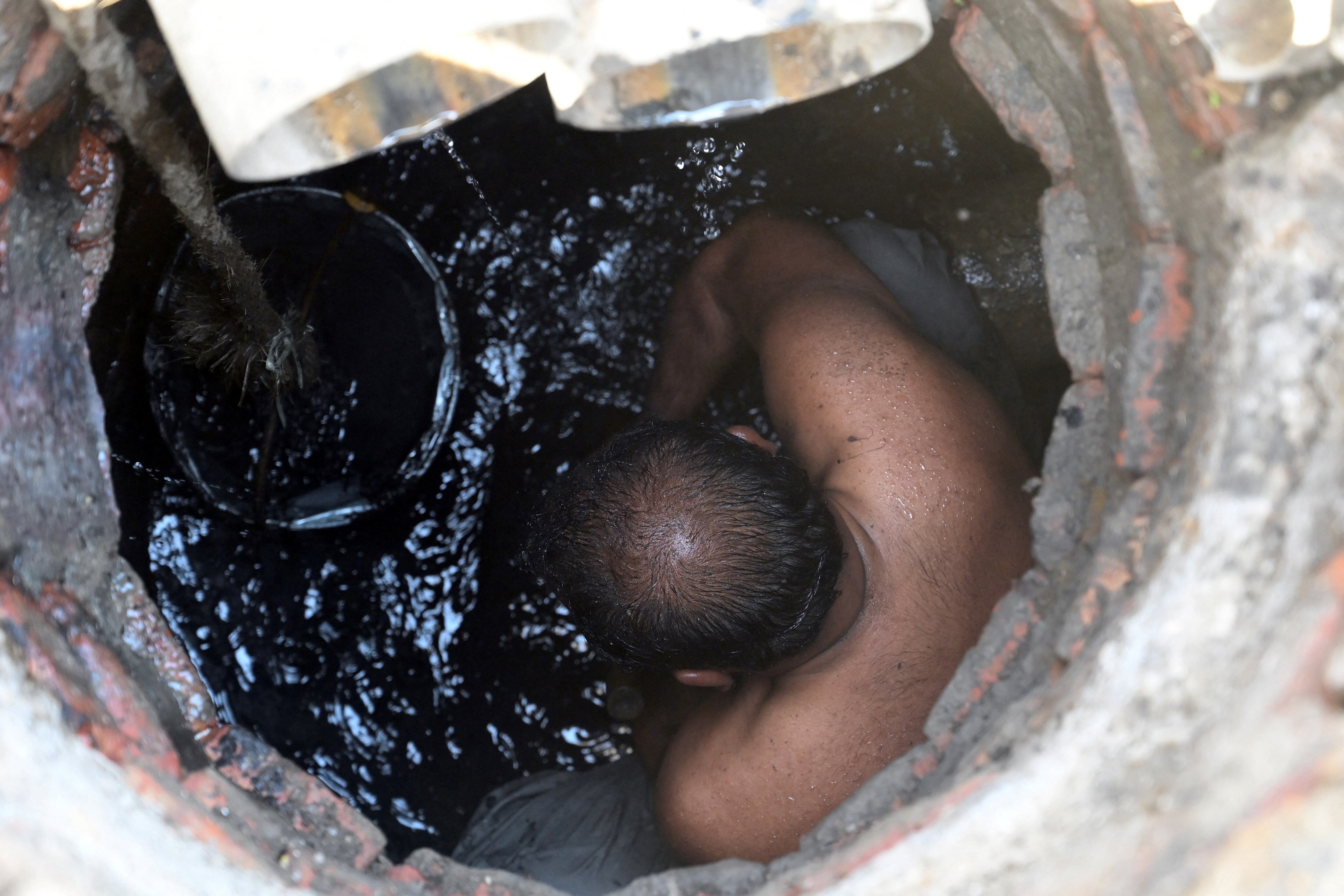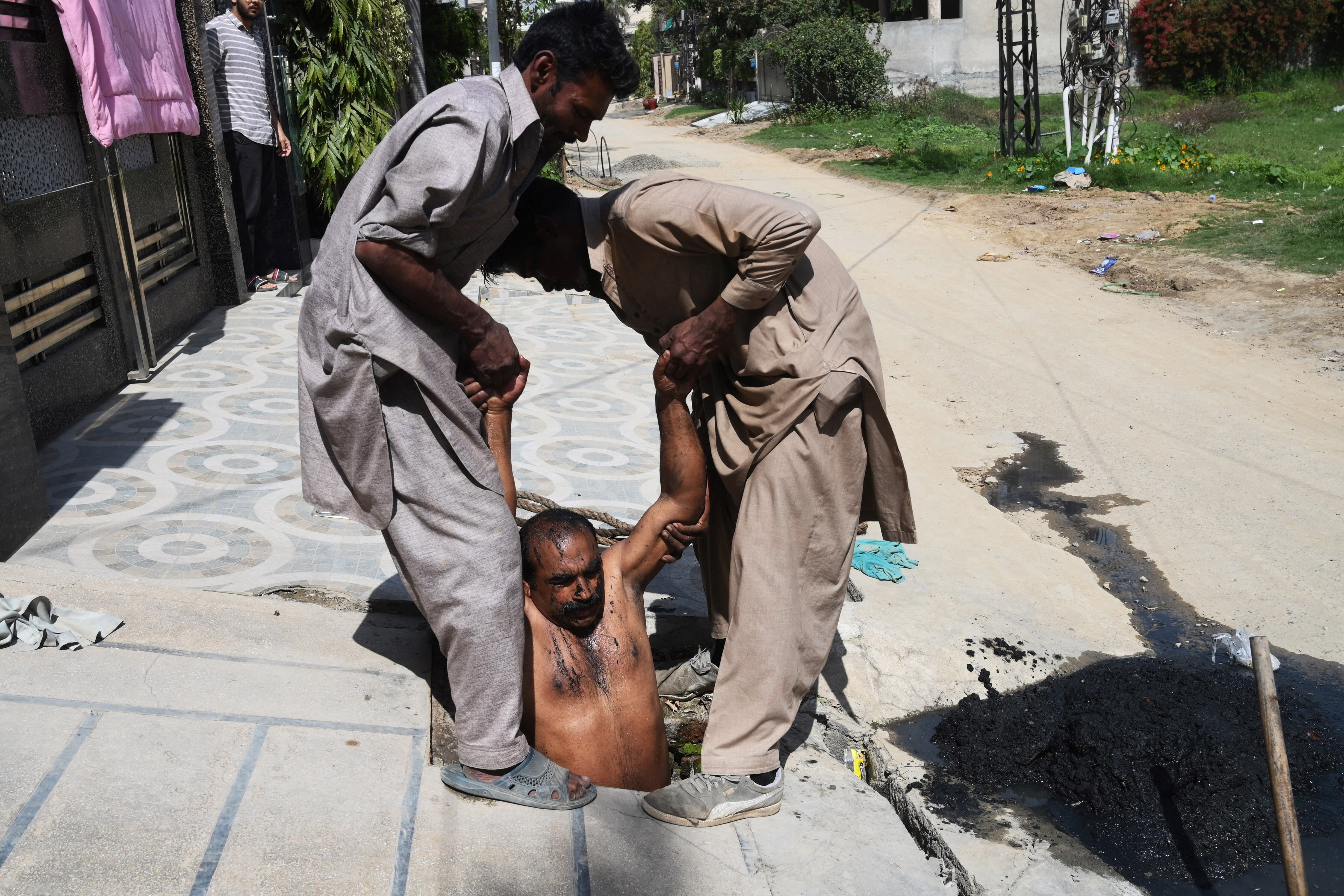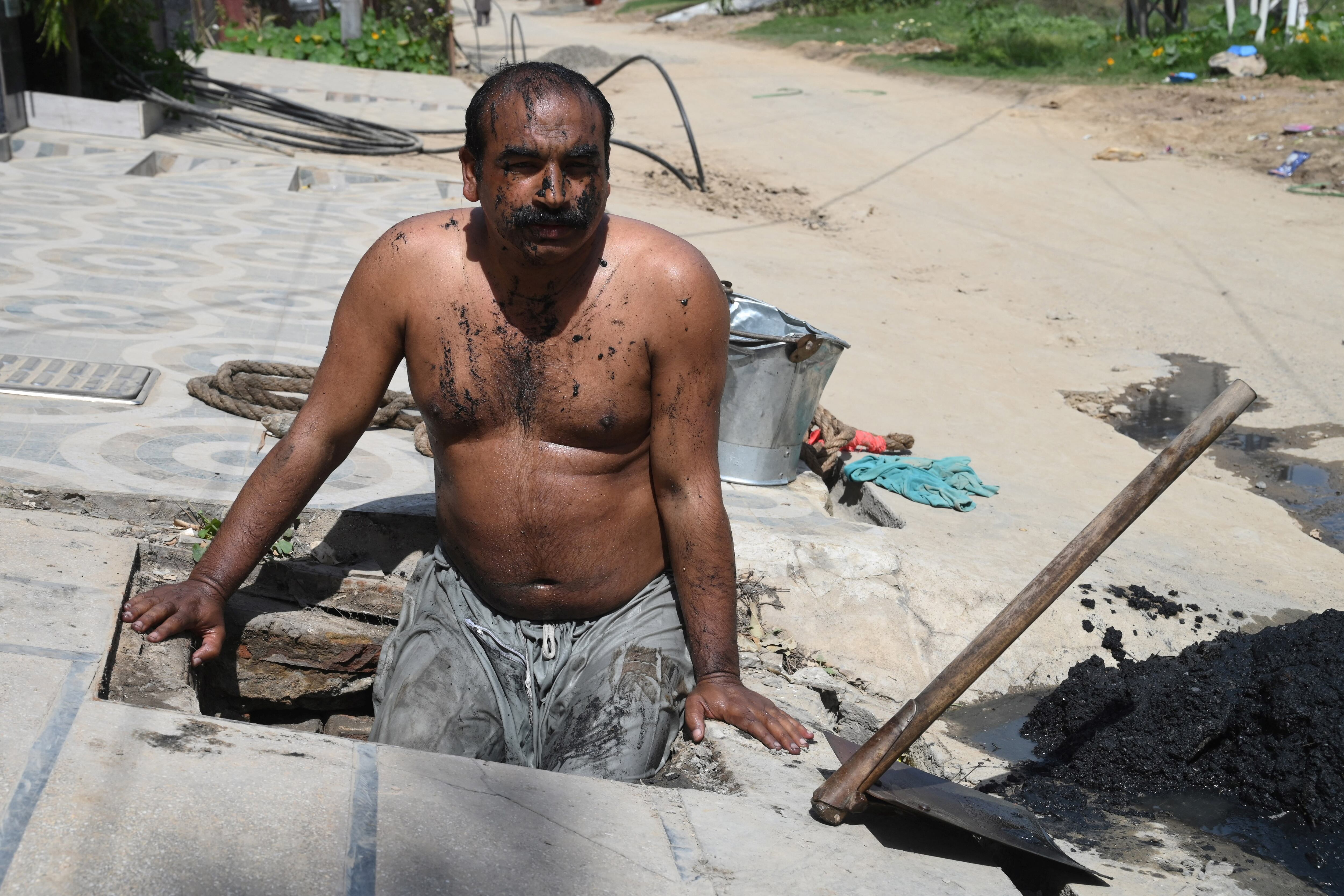 Con el cuerpo medio desnudo y lleno de barro que huele muy mal, Shafiq Masih sale como puede de la alcantarilla que acaba de limpiar a mano en un barrio acomodado de Lahore, en Pakistán.