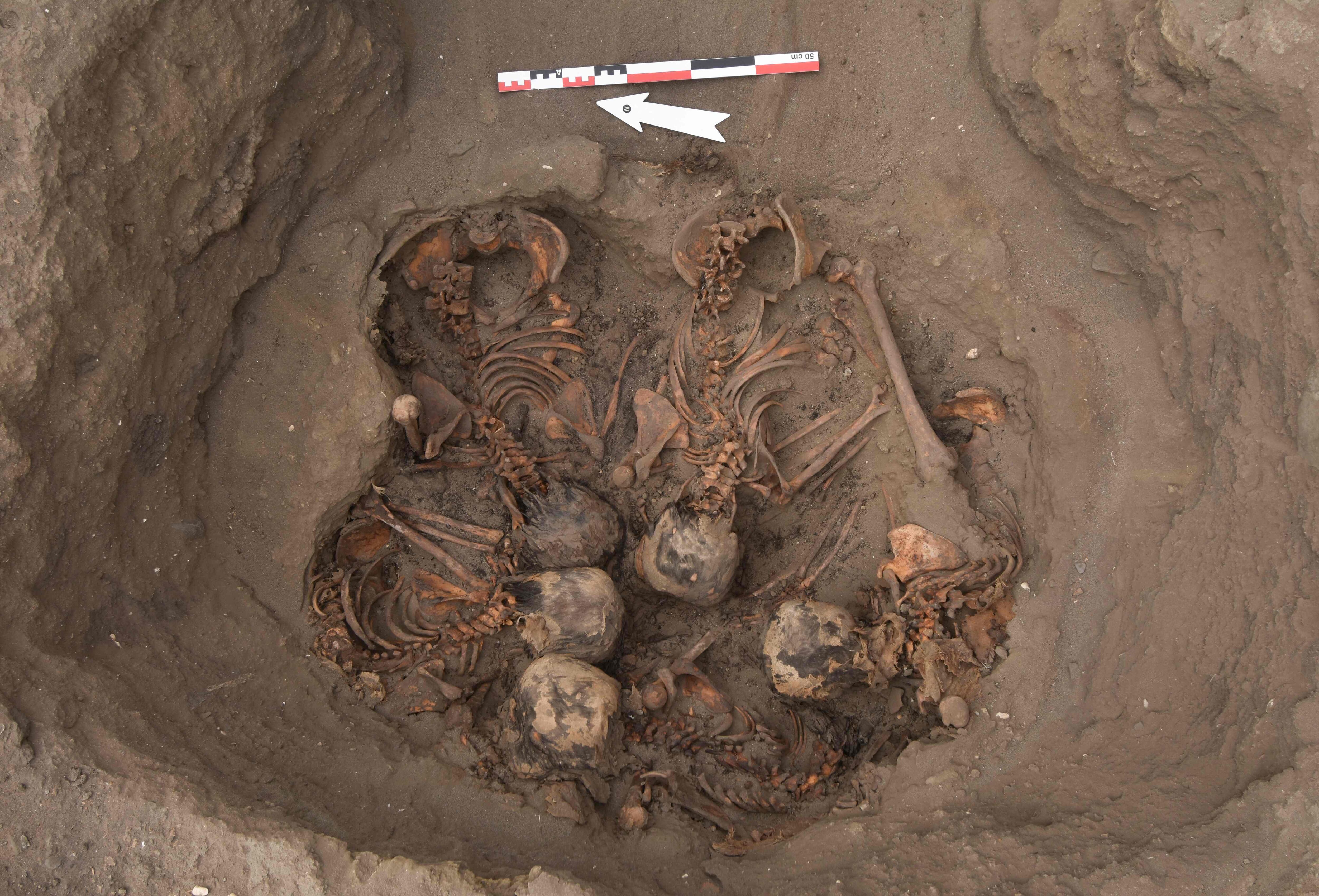 Entre los restos figuran los de cinco muchachas “sentadas” enterradas con sus cabezas juntas, haciendo una especie de círculo.