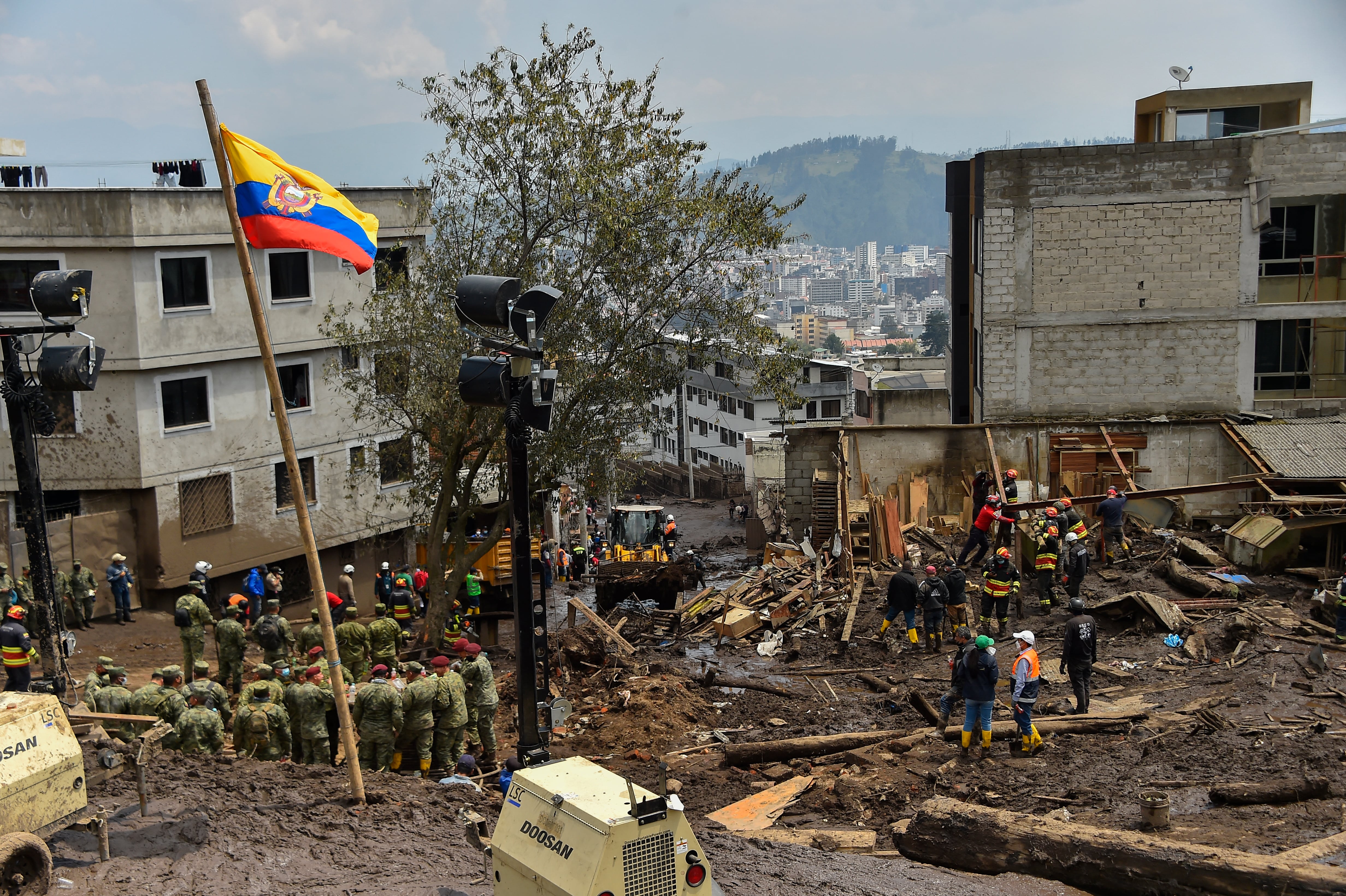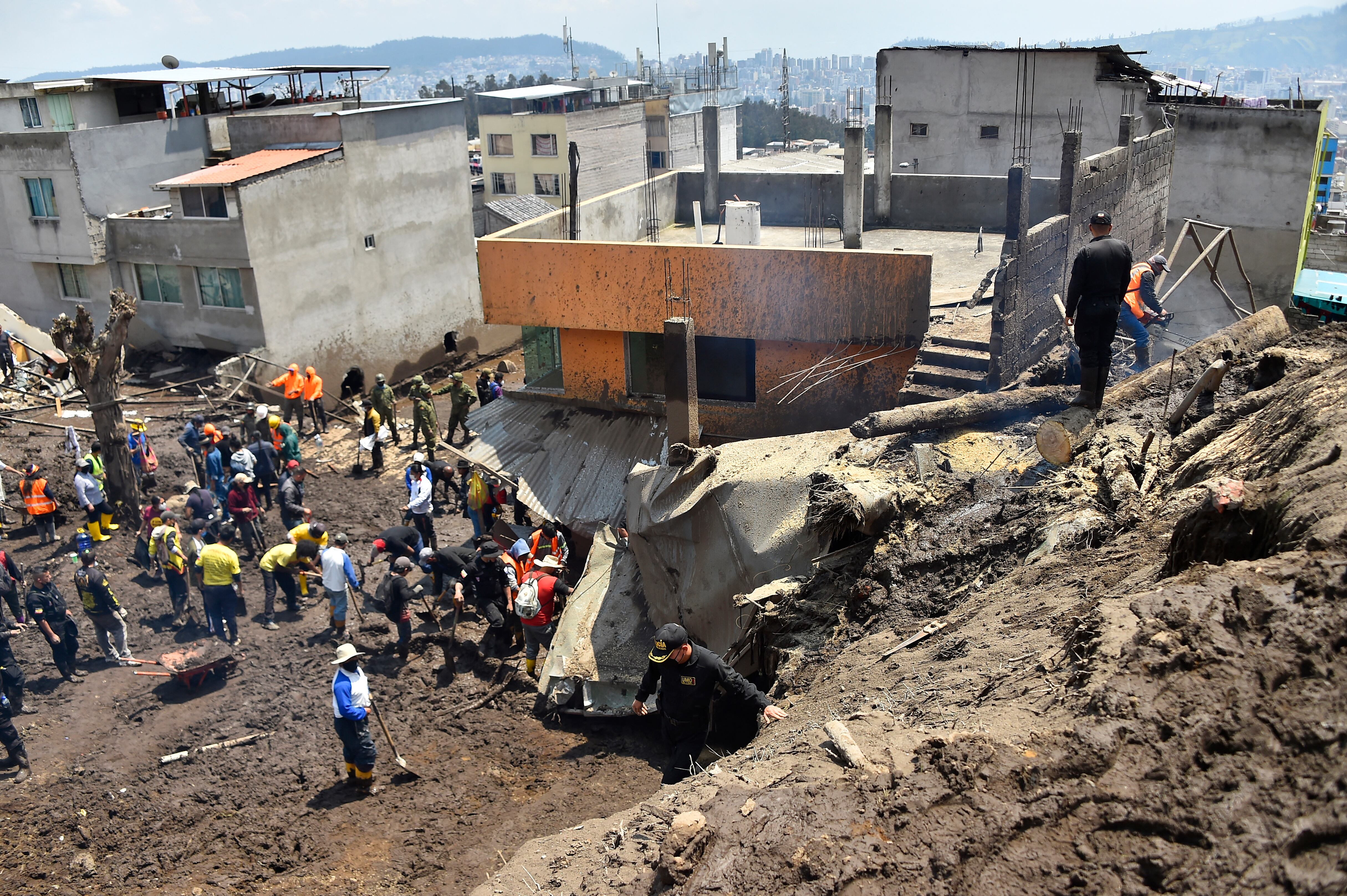 Los rescatistas rastrean lo que era la cancha en la que un numeroso grupo de personas, entre deportistas y público, fue sorprendido por decenas de miles de metros cúbicos de lodo que bajaron con violencia de las faldas de volcán Pichincha, donde está la capital.