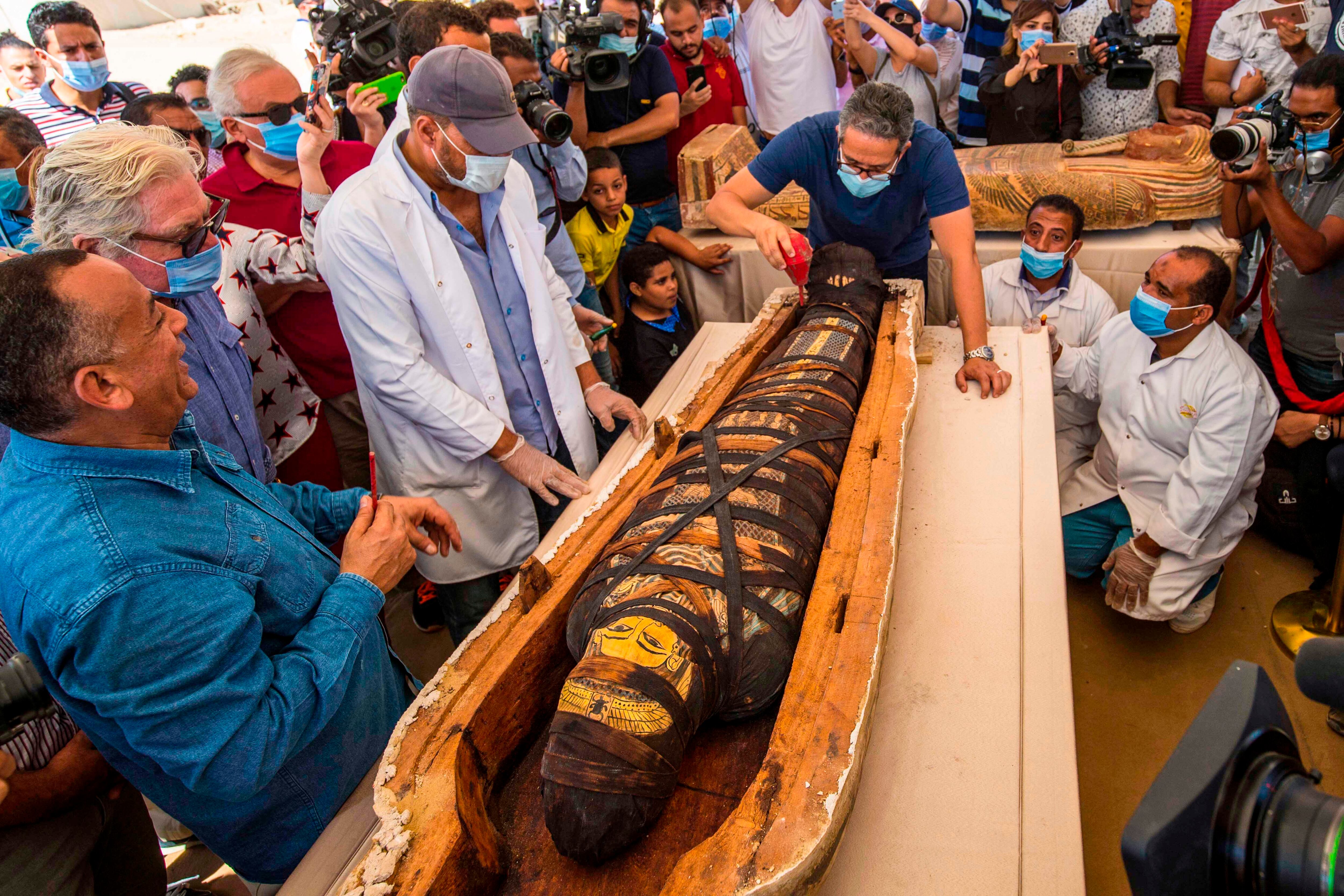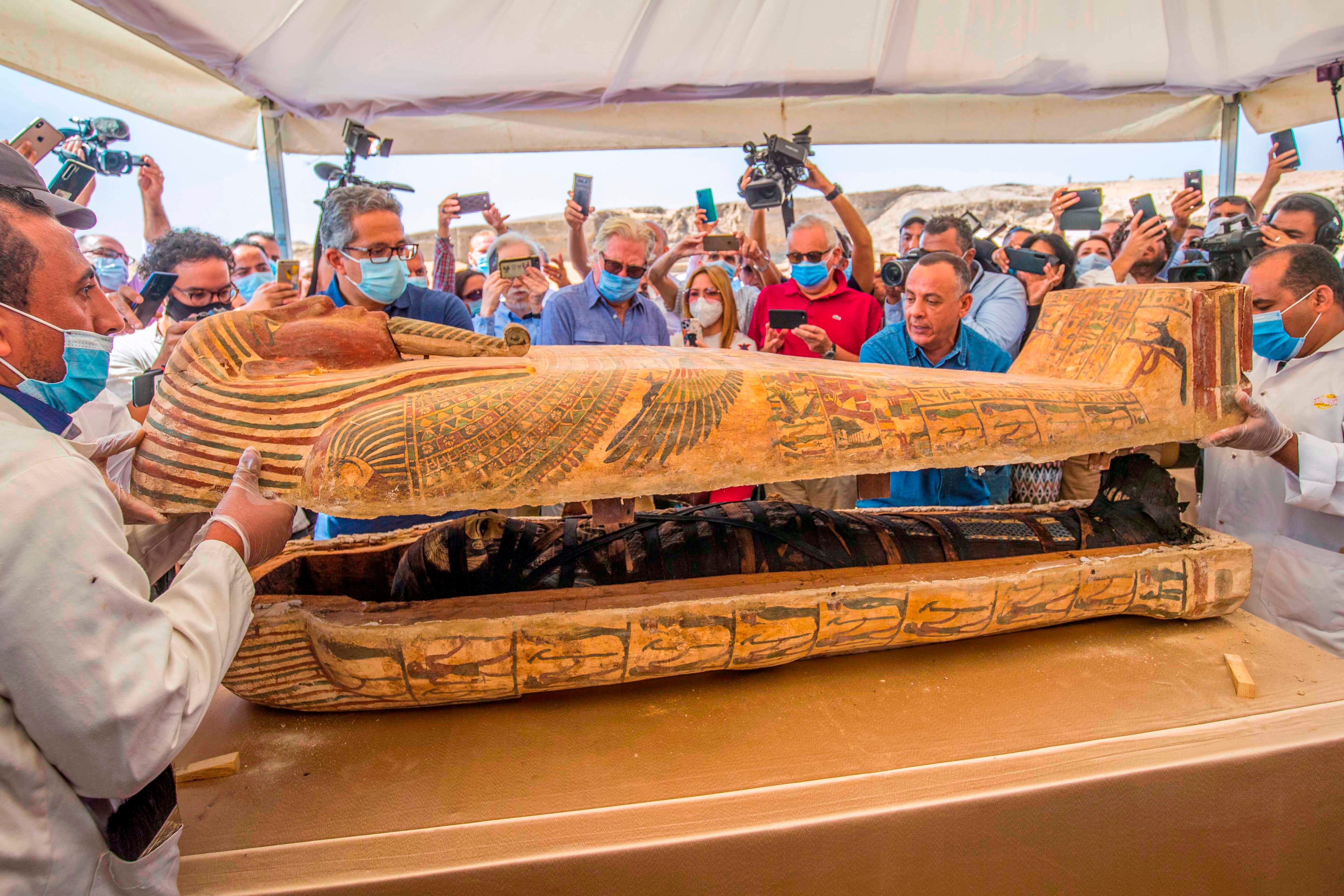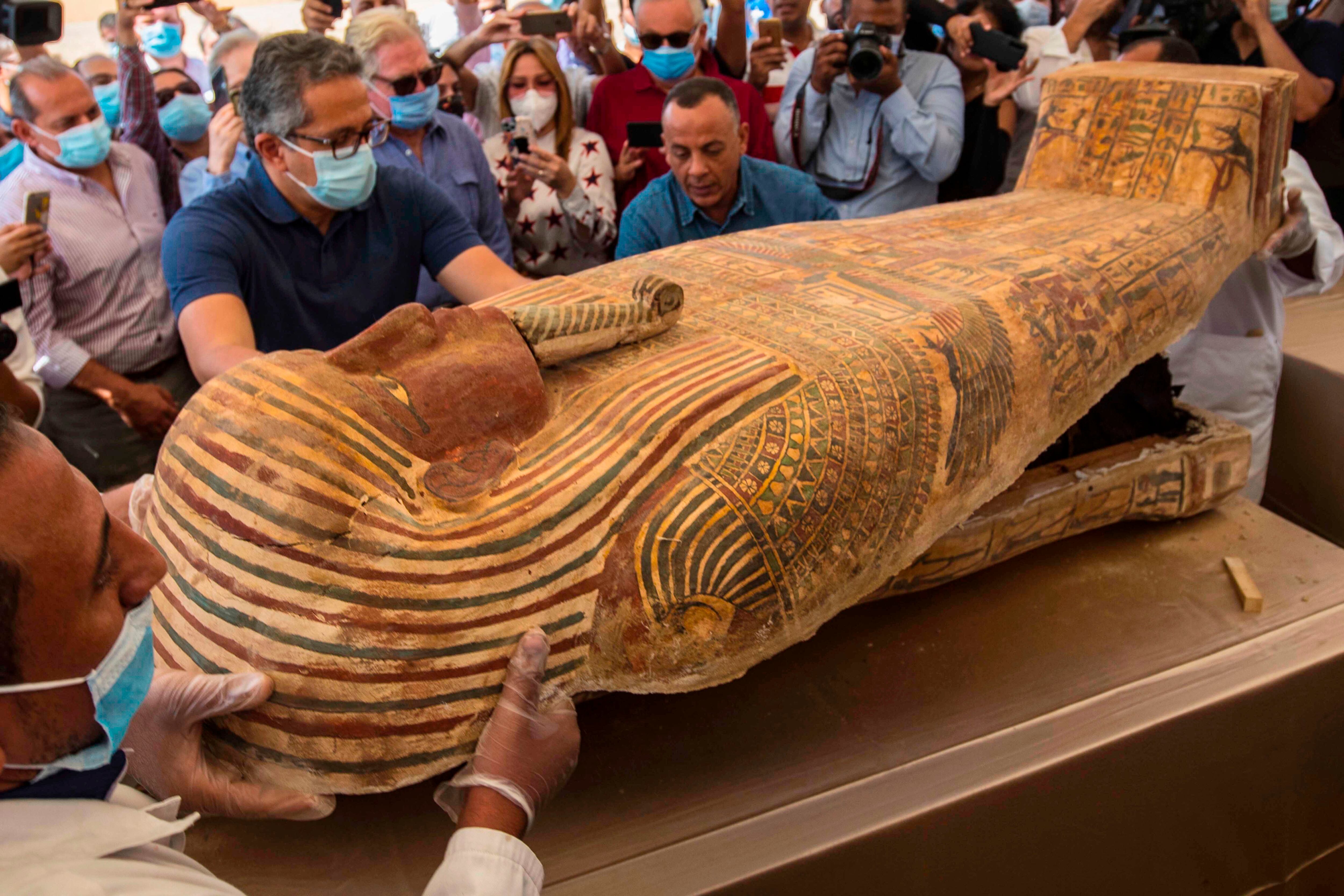 “Estos valiosos y hermosos sarcófagos en madera corresponderían a la dinastía numero XXVII de los faraones, próxima a la dominación persa del Antiguo Egipto”, señaló el ministro Khaled El Enany.