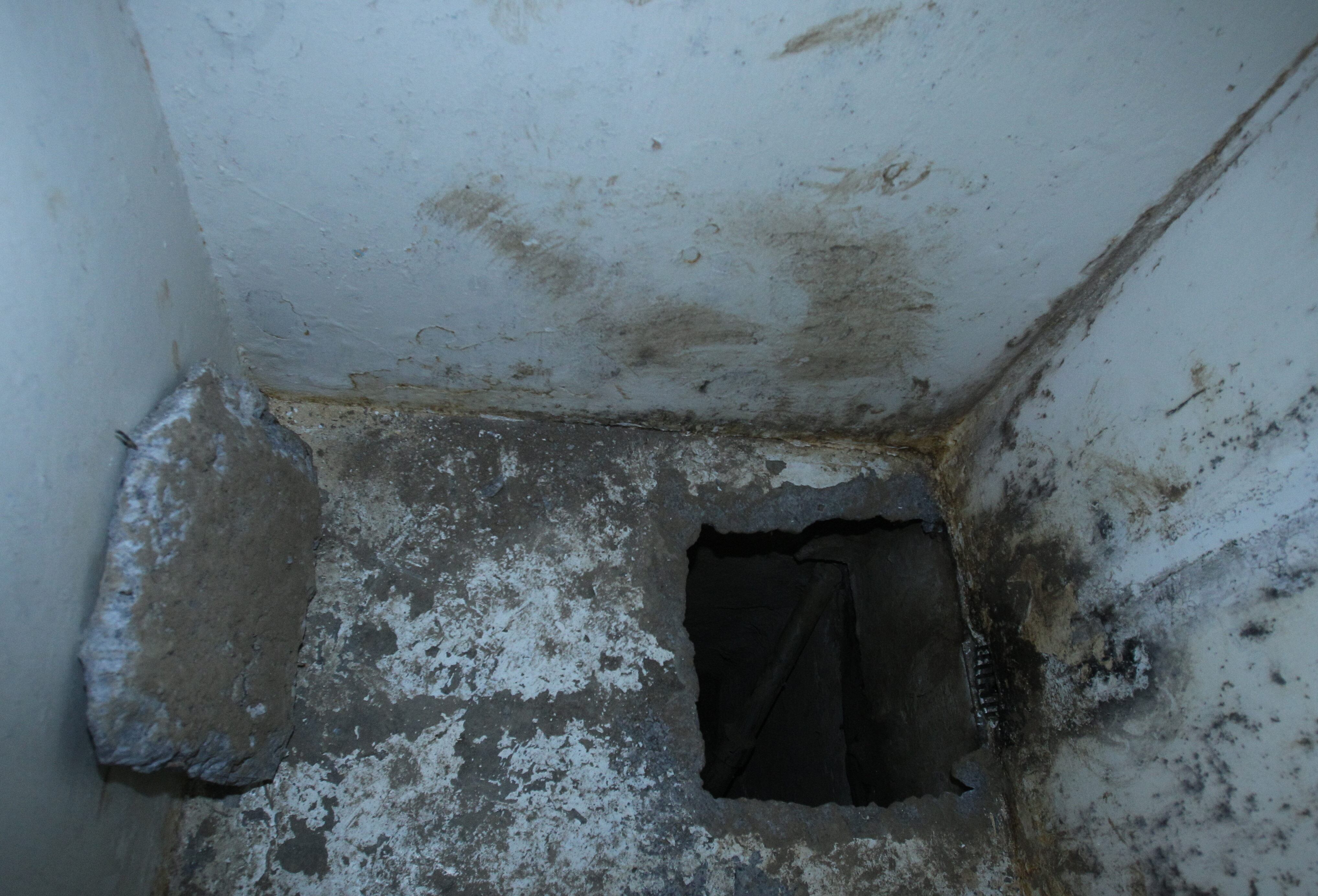 Un túnel de 1,80 metros de altura, alumbrado, con paneles de madera y piso de concreto, llevaba a más escaleras y a una escotilla de metal que daba al sistema de alcantarillado de la ciudad.