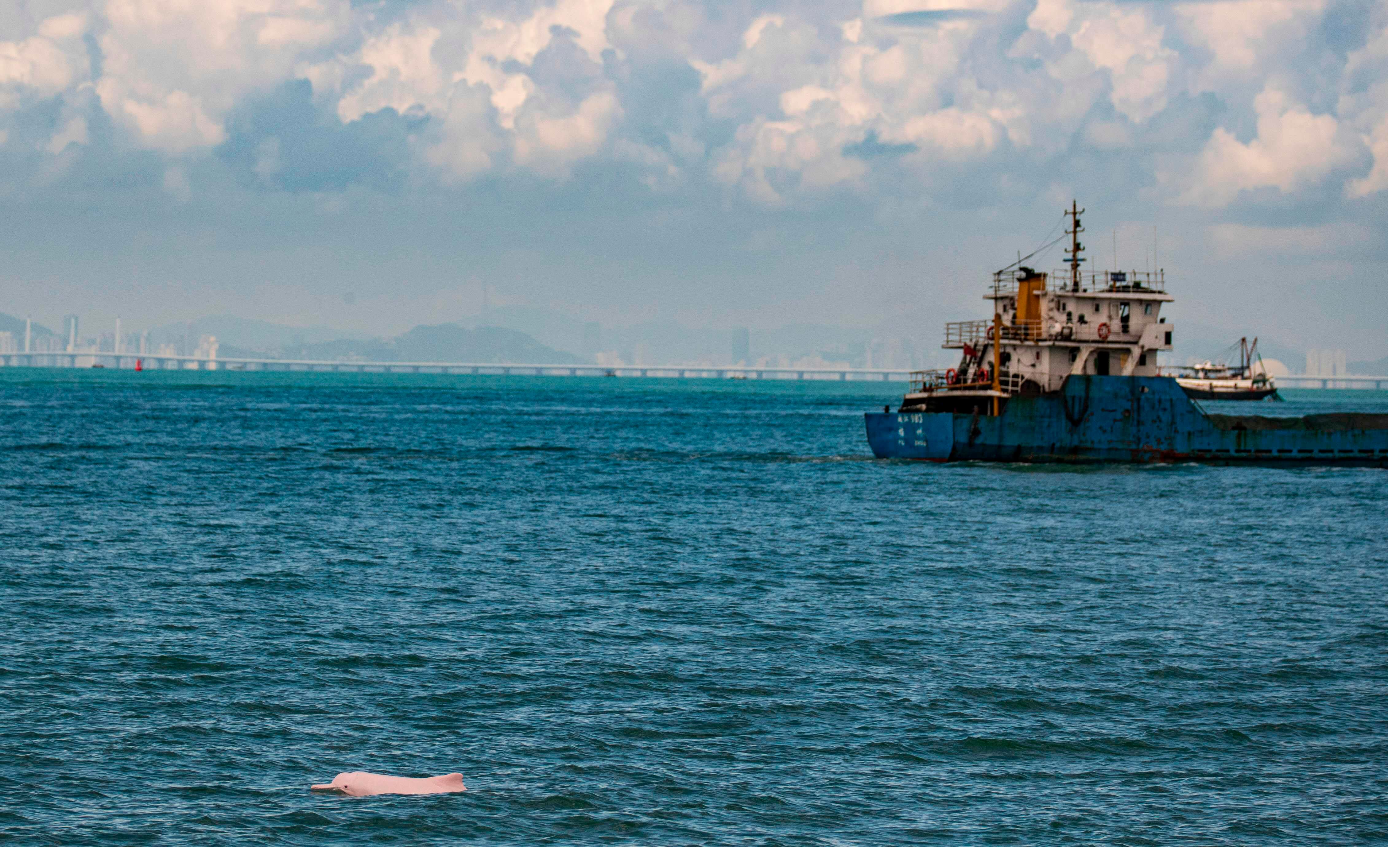 Según su equipo, desde marzo el número de delfines blancos chinos, llamados “delfines rosados” en Hong Kong por su color, aumentó casi un tercio en estas aguas.