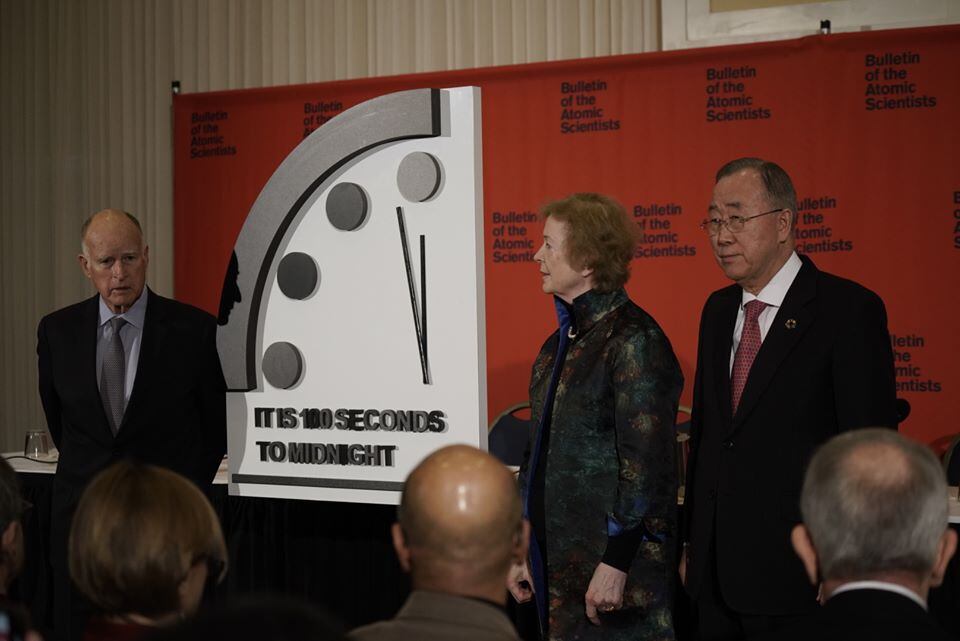 El Reloj del Apocalipsis, creado en 1947 para simbolizar la inminencia de un cataclismo planetario, fue adelantado hasta marcar 100 segundos para la medianoche (el fin de mundo). Este cambio estuvo a cargo de los científicos que lo manejan, quienes insistieron en los peligros que genera el cambio climático y la proliferación nuclear.