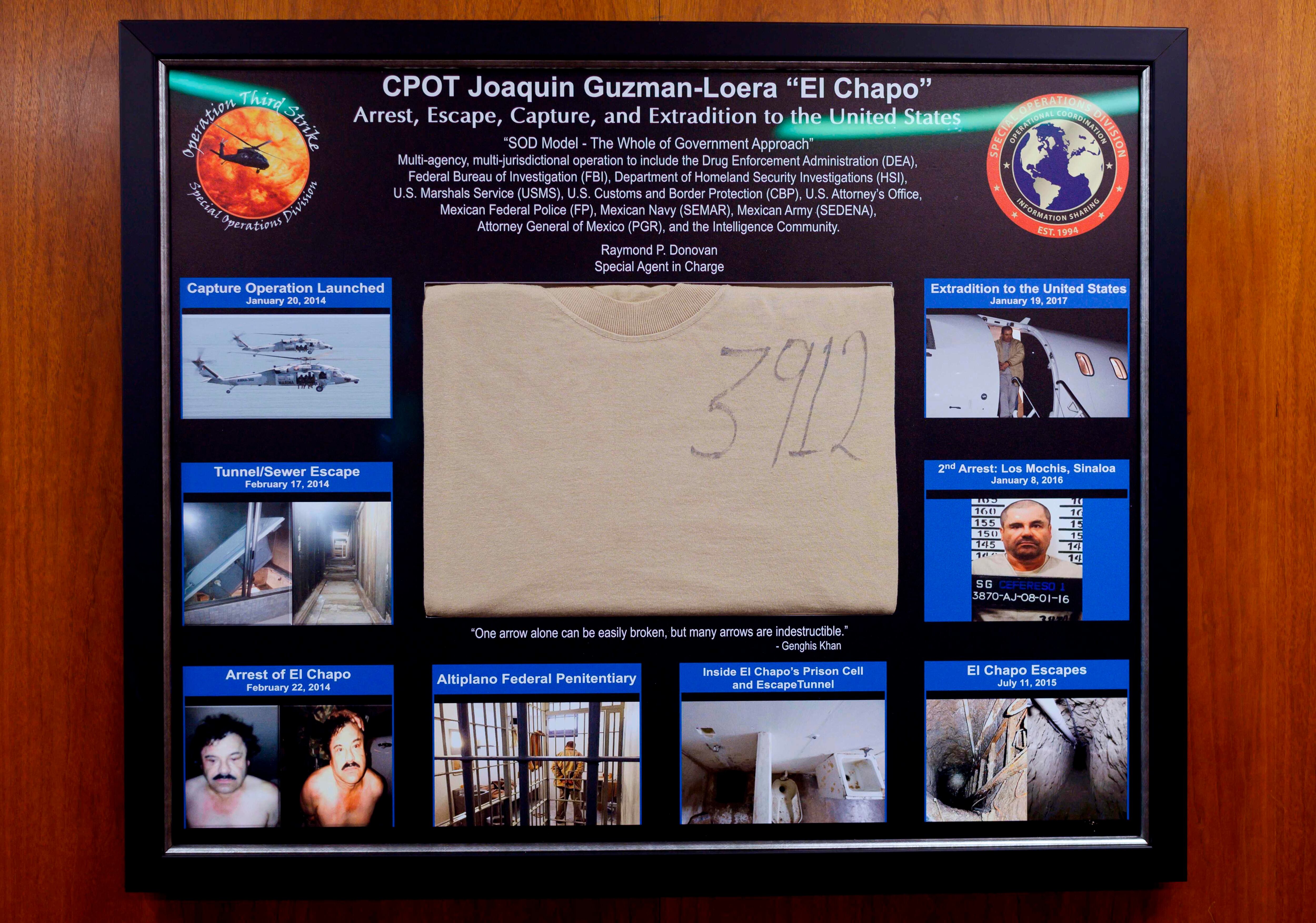 En su despacho en Chelsea, enmarcada como un trofeo, tiene la camiseta beige con el número de preso 3912, que el exjefe del cartel de Sinaloa llevaba puesta cuando fue extraditado a Estados Unidos el 19 de enero de 2017.