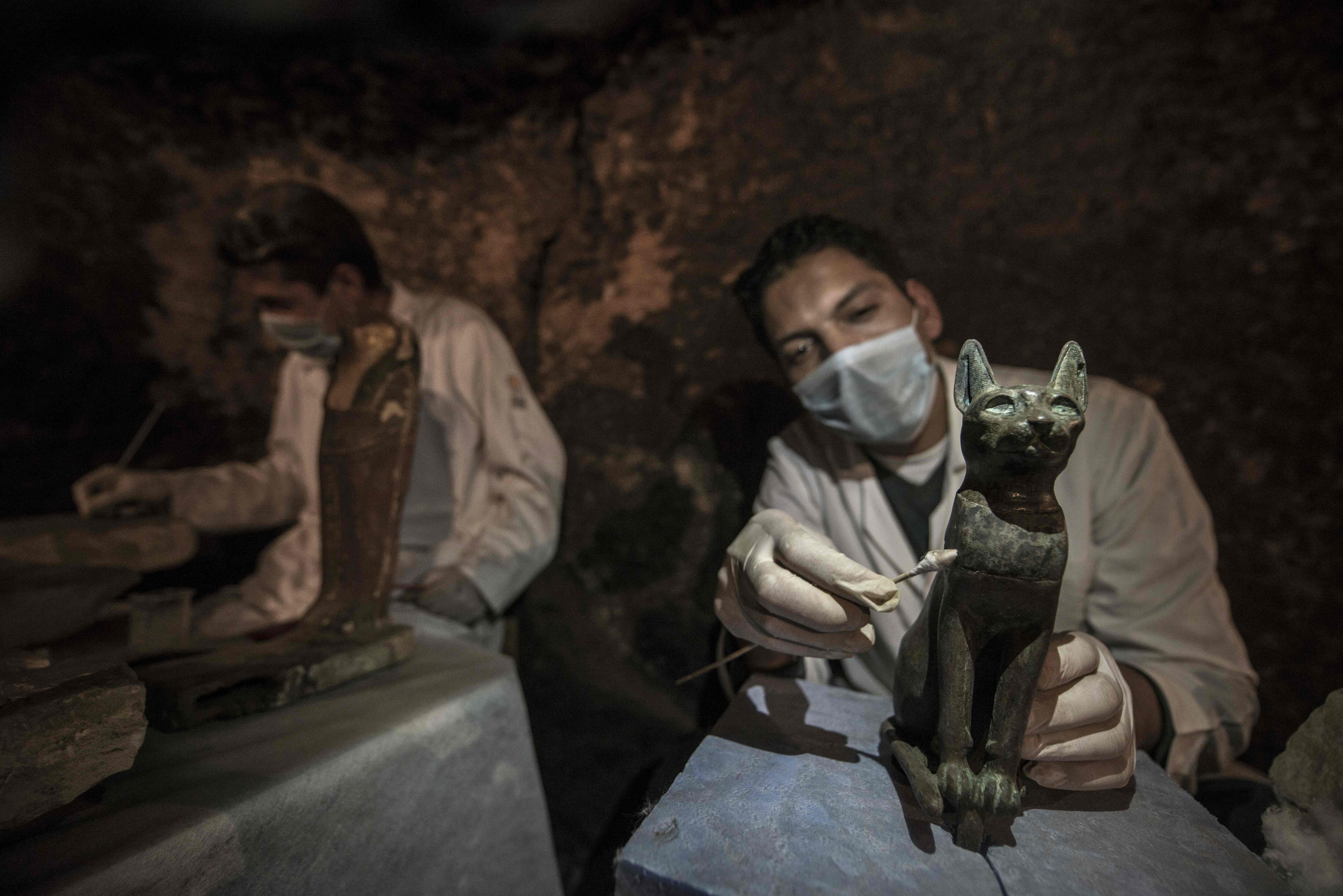 Además se descubrieron decenas de gatos momificados al igual que 100 estatuas de gatos en madera dorada y una estatua de bronce, dedicados a la diosa gata Bastet.