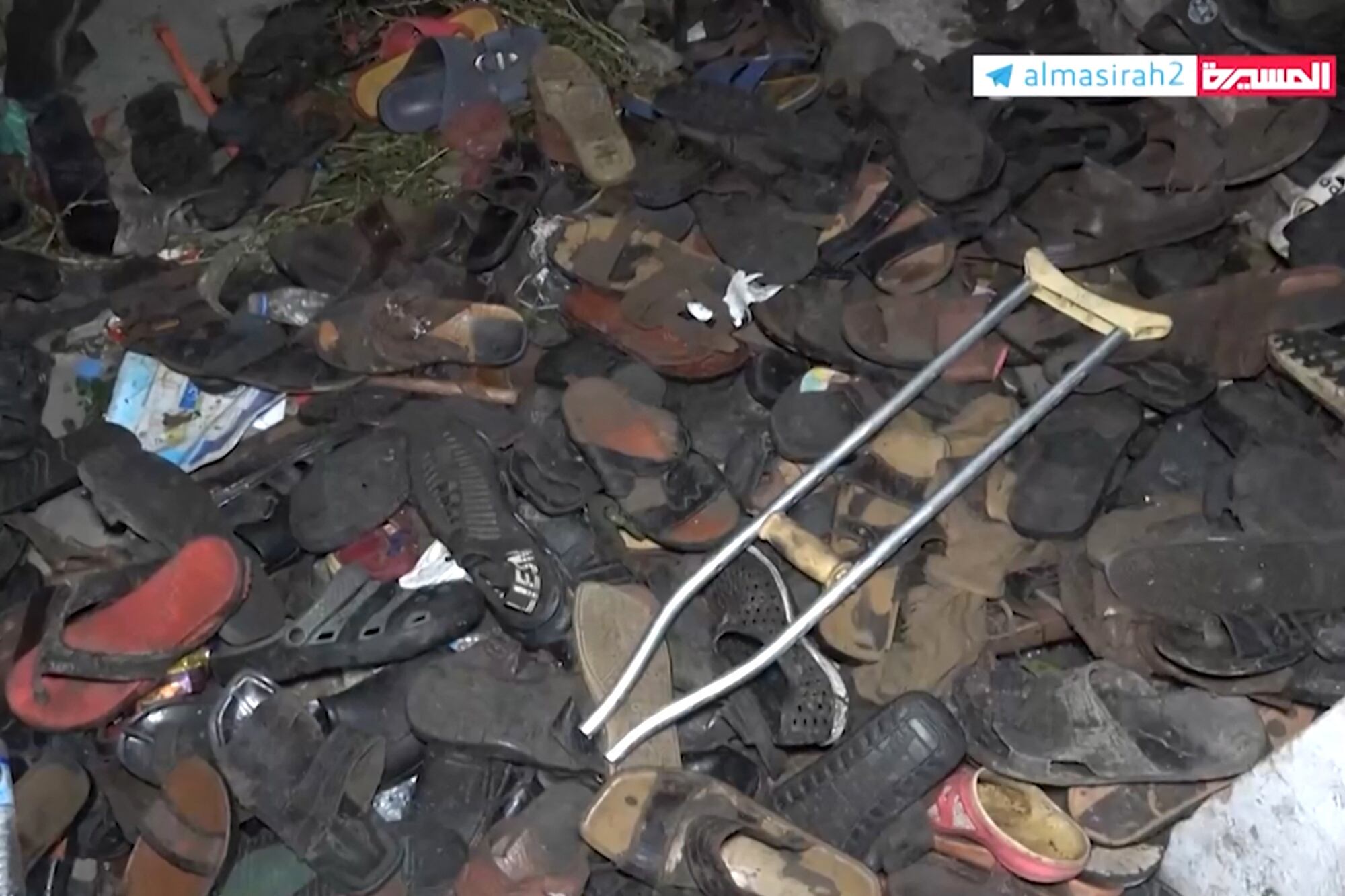 Otras tomas mostraron los cadáveres en el suelo en medio del pánico. Posteriormente, el sitio quedó cubierto de pilas de sandalias abandonadas, ropa y una muleta, mientras un investigador en traje de protección recogía evidencia.