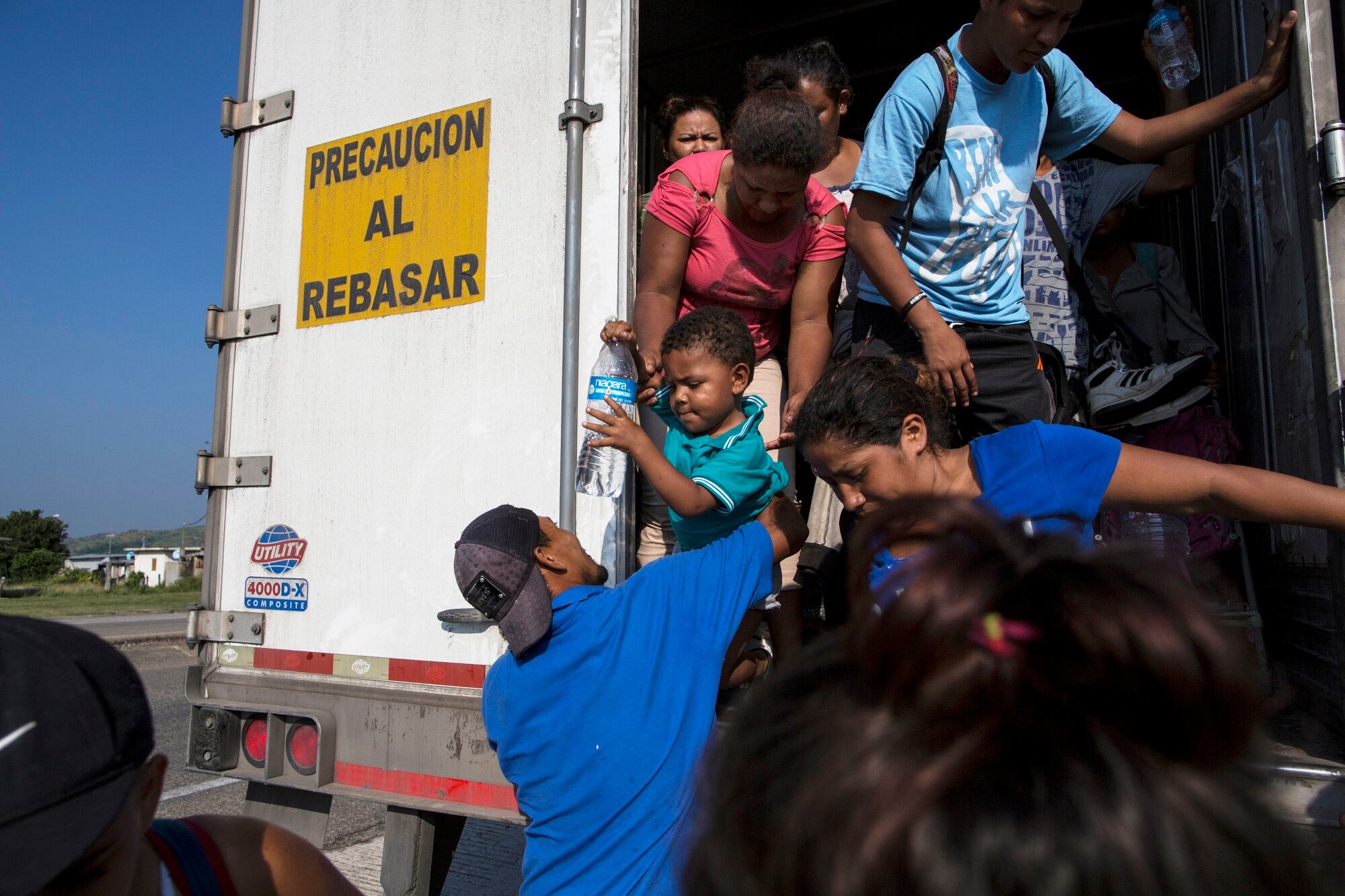 Otros saltaban a los camiones que les ofrecían transporte. Yamilet decidió que no había forma de llegar a su destino caminando. Encontró un camión de mercancías donde los migrantes les ayudaron a subir los cochecitos _ uno de ellos con Eduardo todavía sentado en él _ y a sus otros dos hijos. Se hacinaron en la parte trasera con más de un centenar de personas. El conductor dejó la puerta abierta para que no se asfixiasen.