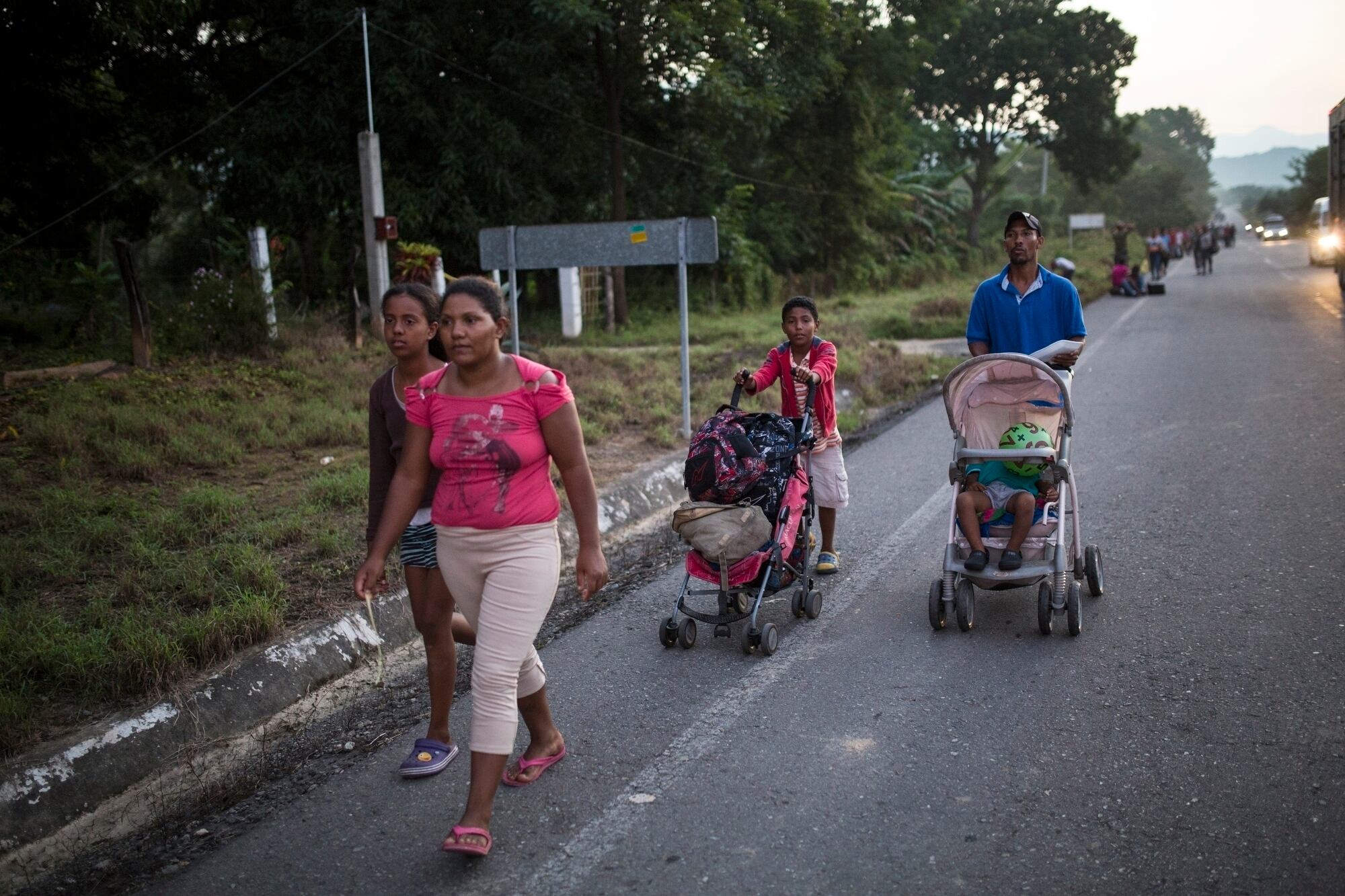 La familia llegó a Santa Rosa de Copán a las 3 de la madrugada y caminó siete horas con la caravana hasta la frontera entre Guatemala y México, y durmieron sobre el puente internacional.