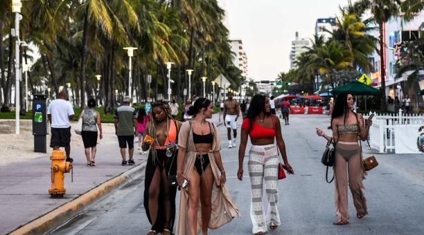 En Ocean Drive, el epicentro de la fiesta en Miami y un imán para el turismo mundial, visitantes de Missouri, Texas, Georgia y otras partes del país recorren el paseo marítimo.