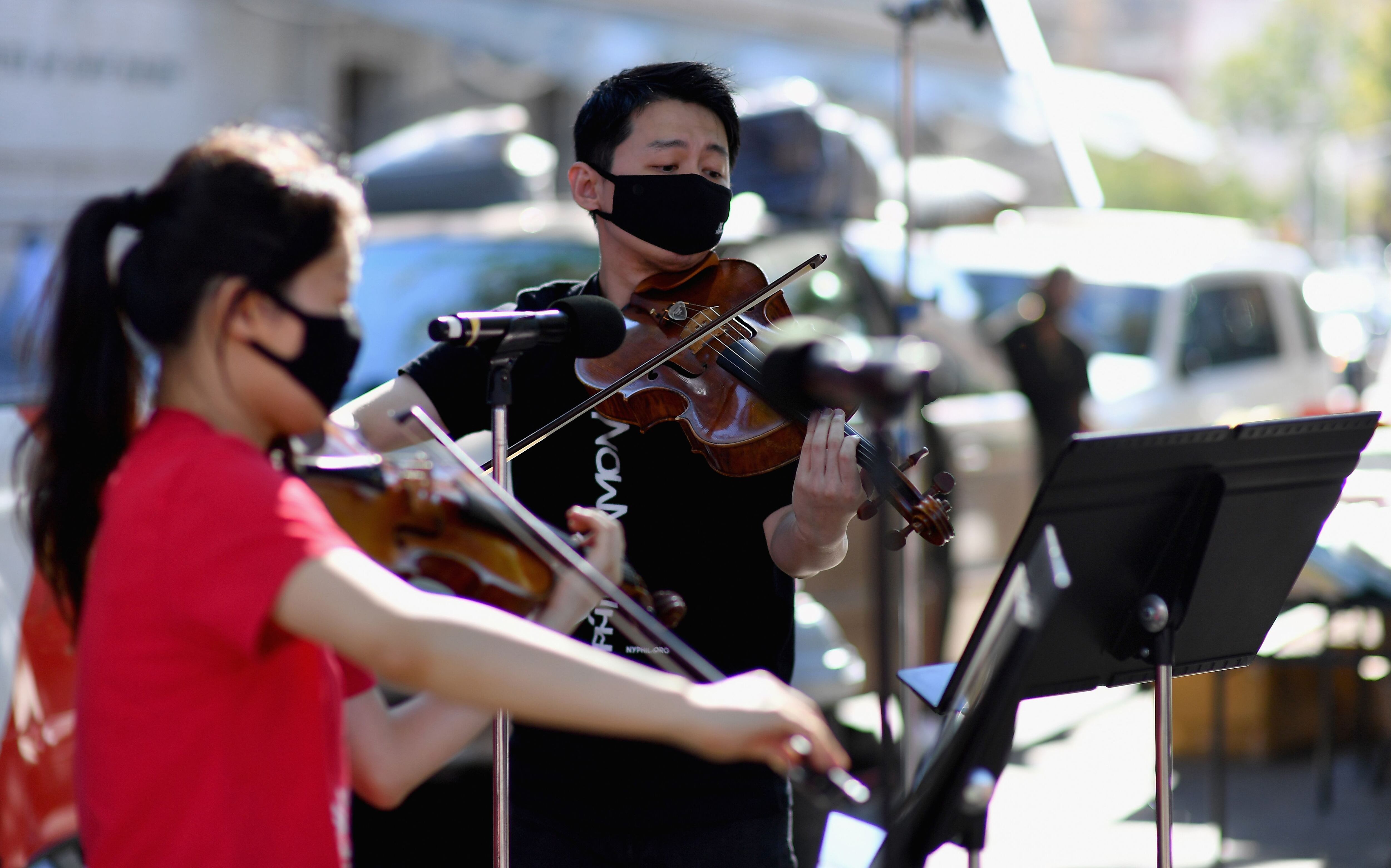 Con la temporada de otoño cancelada y la sala cerrada debido al coronavirus, Quan Ge, Cong Wu y sus violines actúan frente a la furgoneta de la orquesta, que acertadamente se llama Bandwagon, un juego de palabras entre "tren en marcha" y "vehículo de la orquesta".
