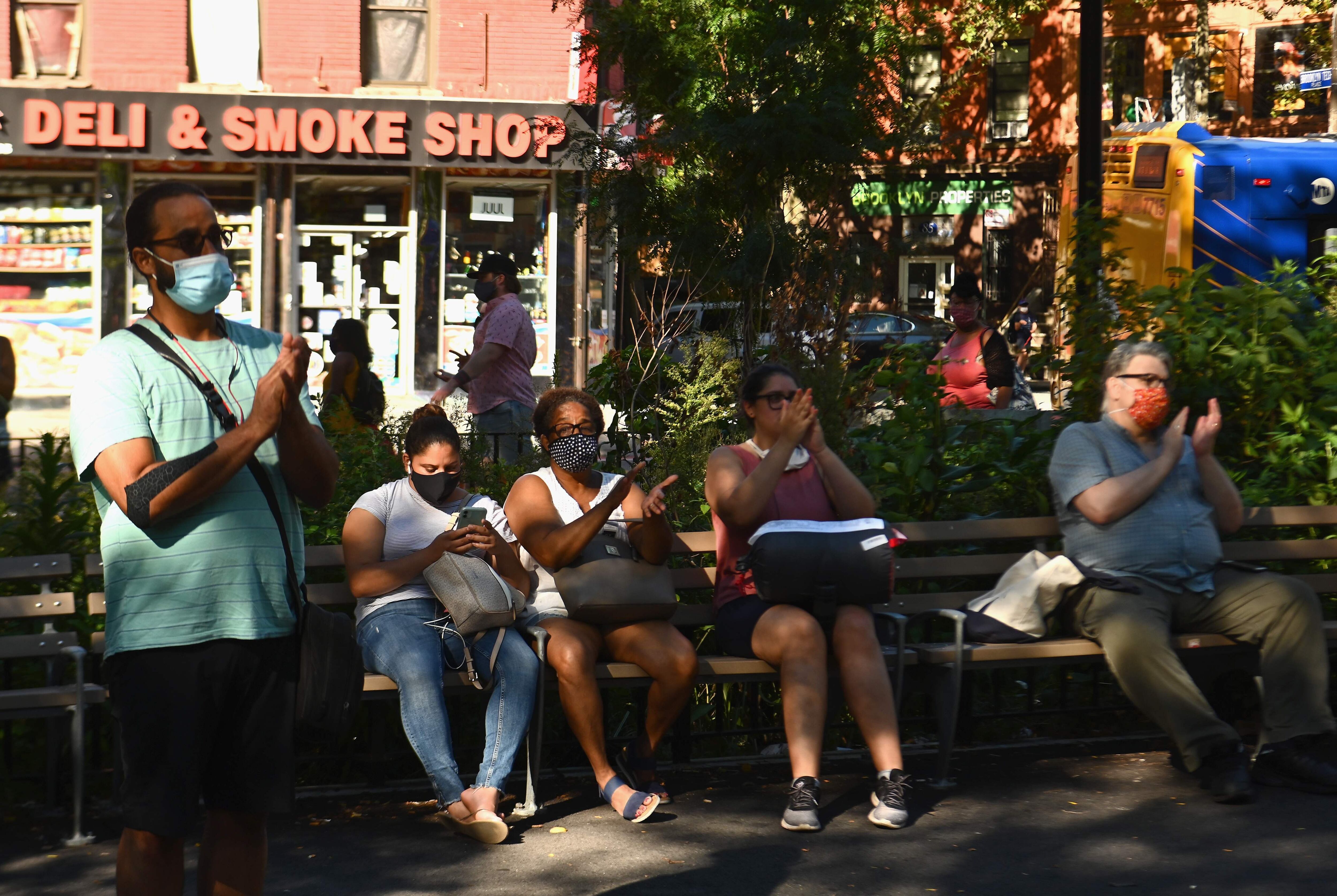 En el pequeño jardín público, a pocos metros de la Academia de Música de Brooklyn, los músicos, utilizando tapabocas y separados como mandan los protocolos sanitarios, terminan con la balada “Somewhere” del musical “West Side Story”.