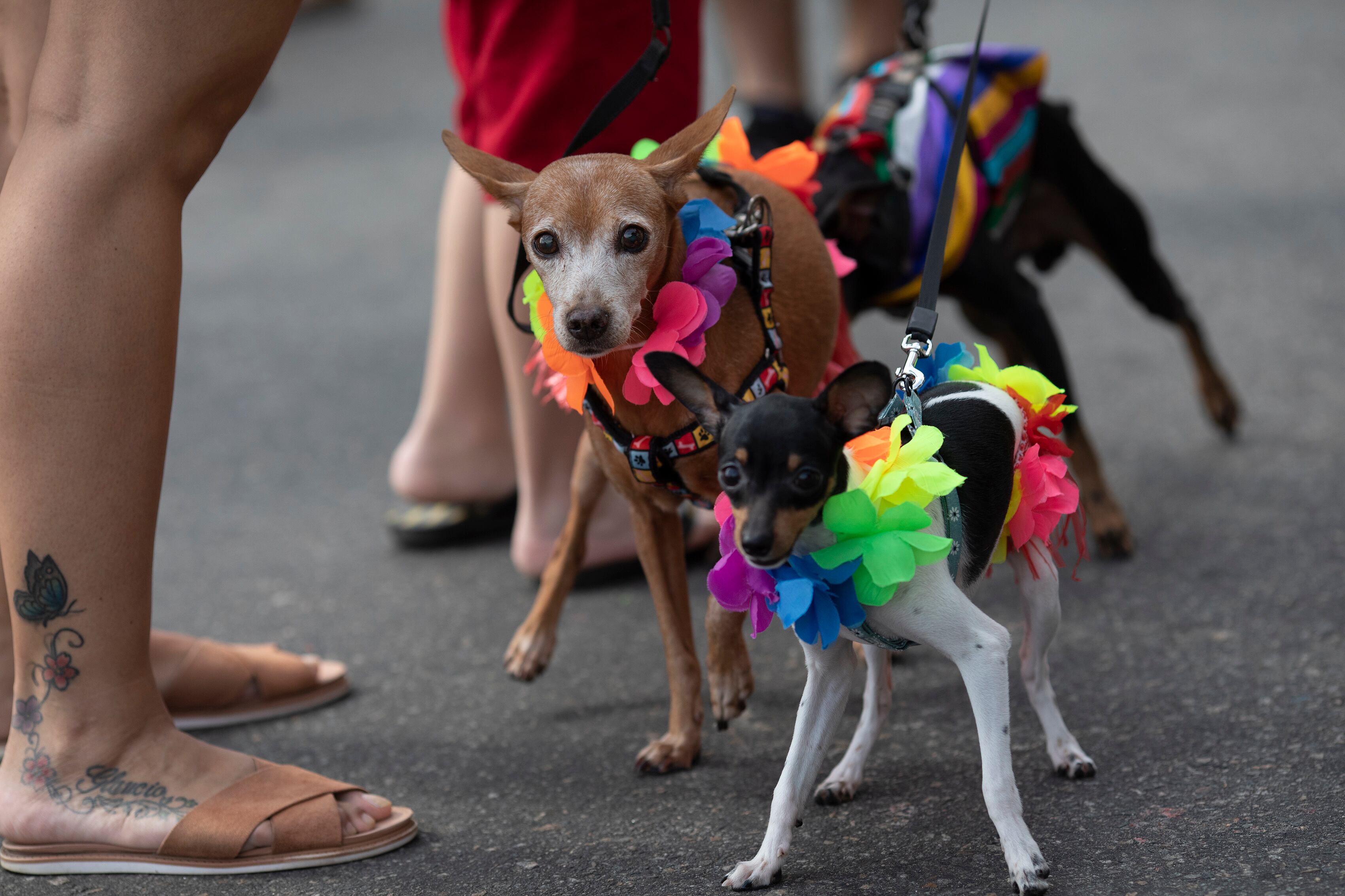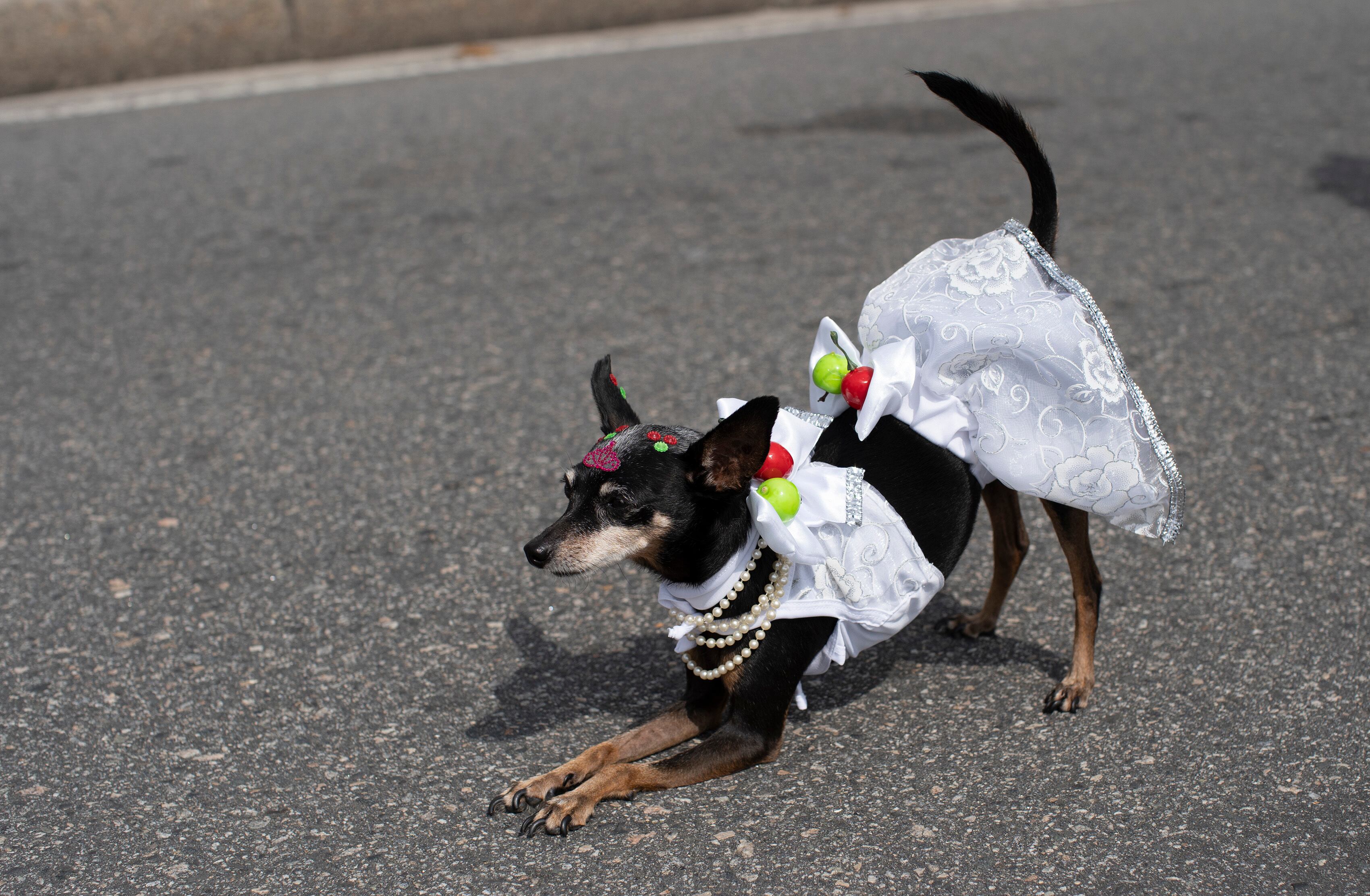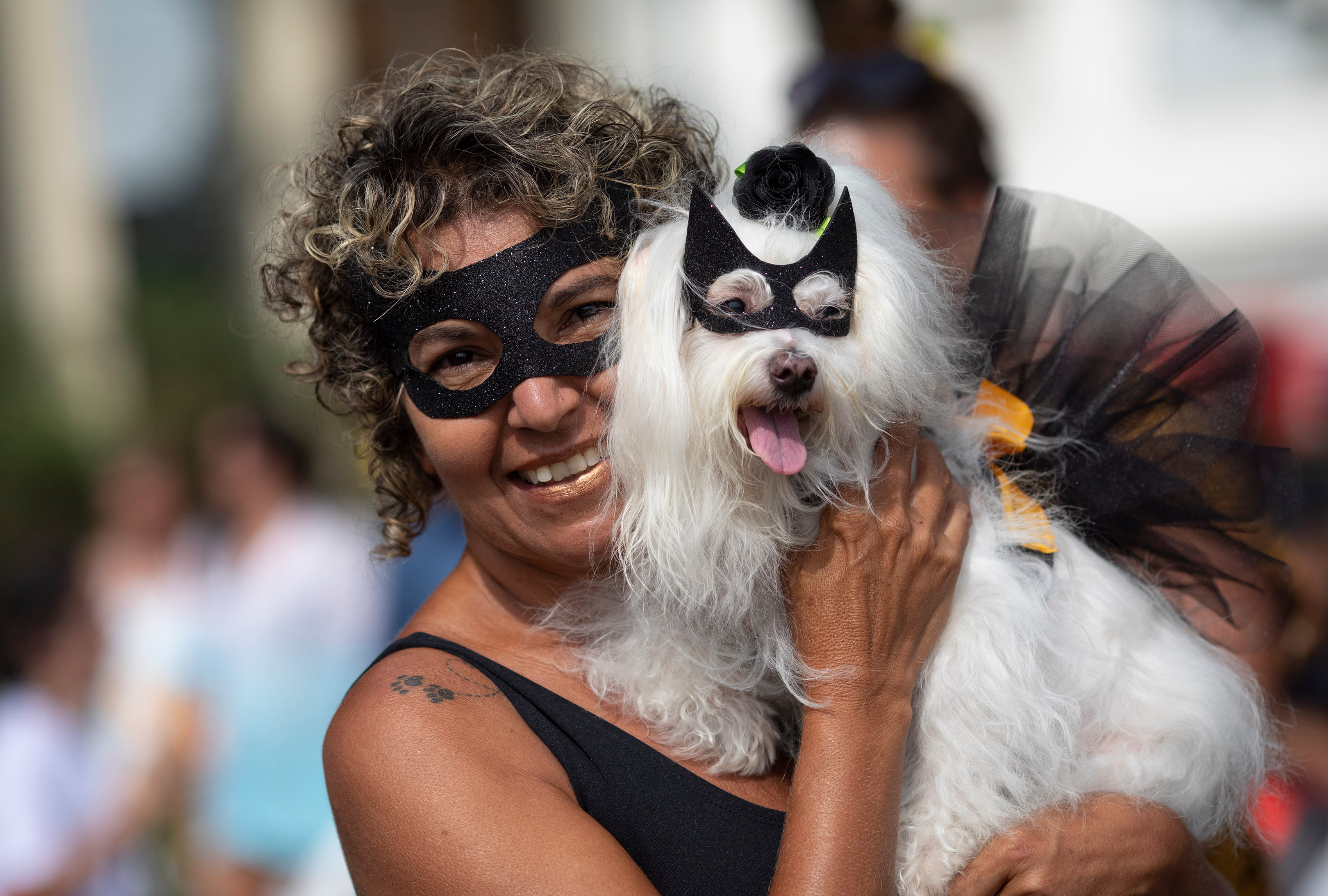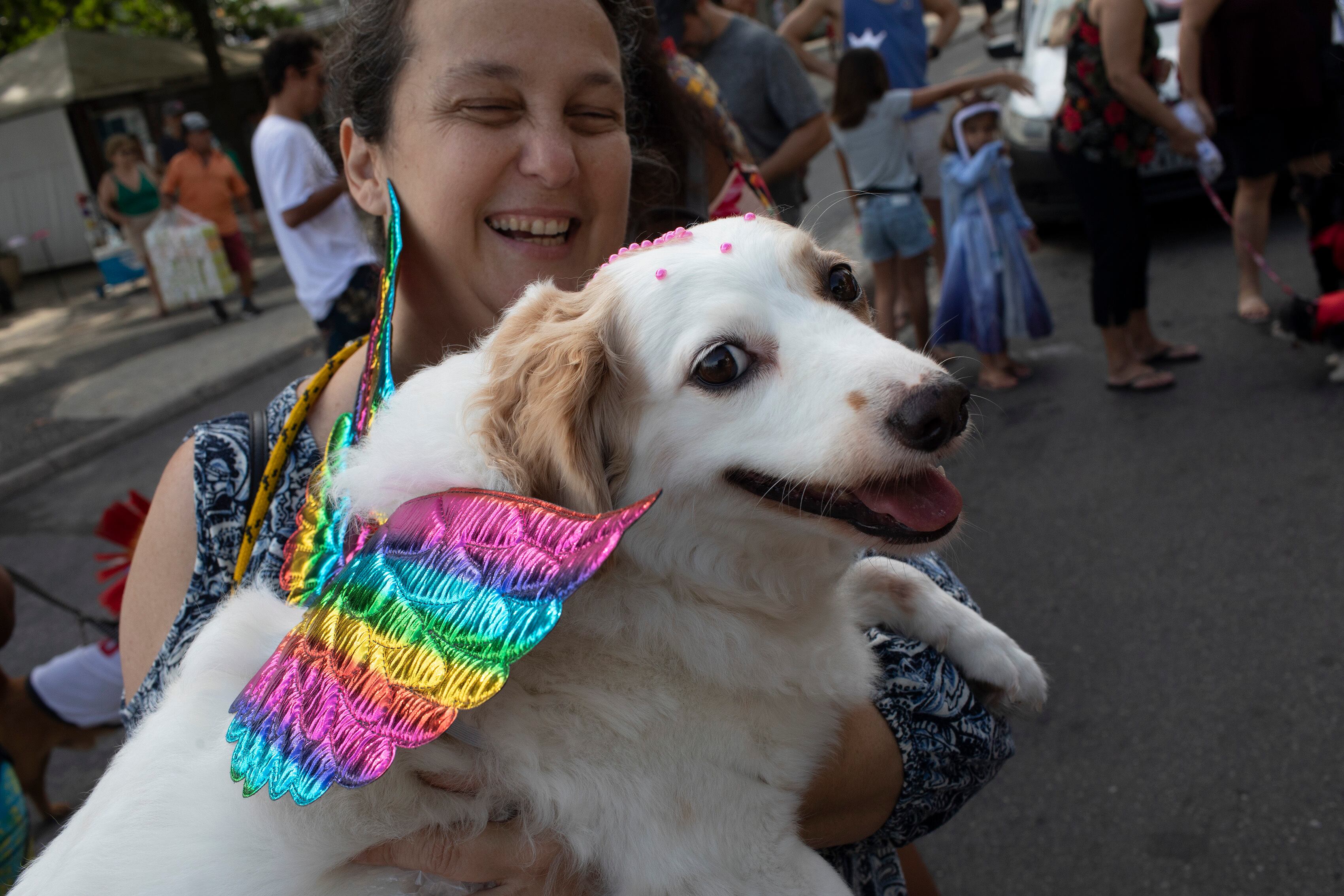 Decenas de perros disfrazados participaron el domingo del tradicional blocão, un desfile canino que se realiza cada año en el malecón de la playa de Copacabana.