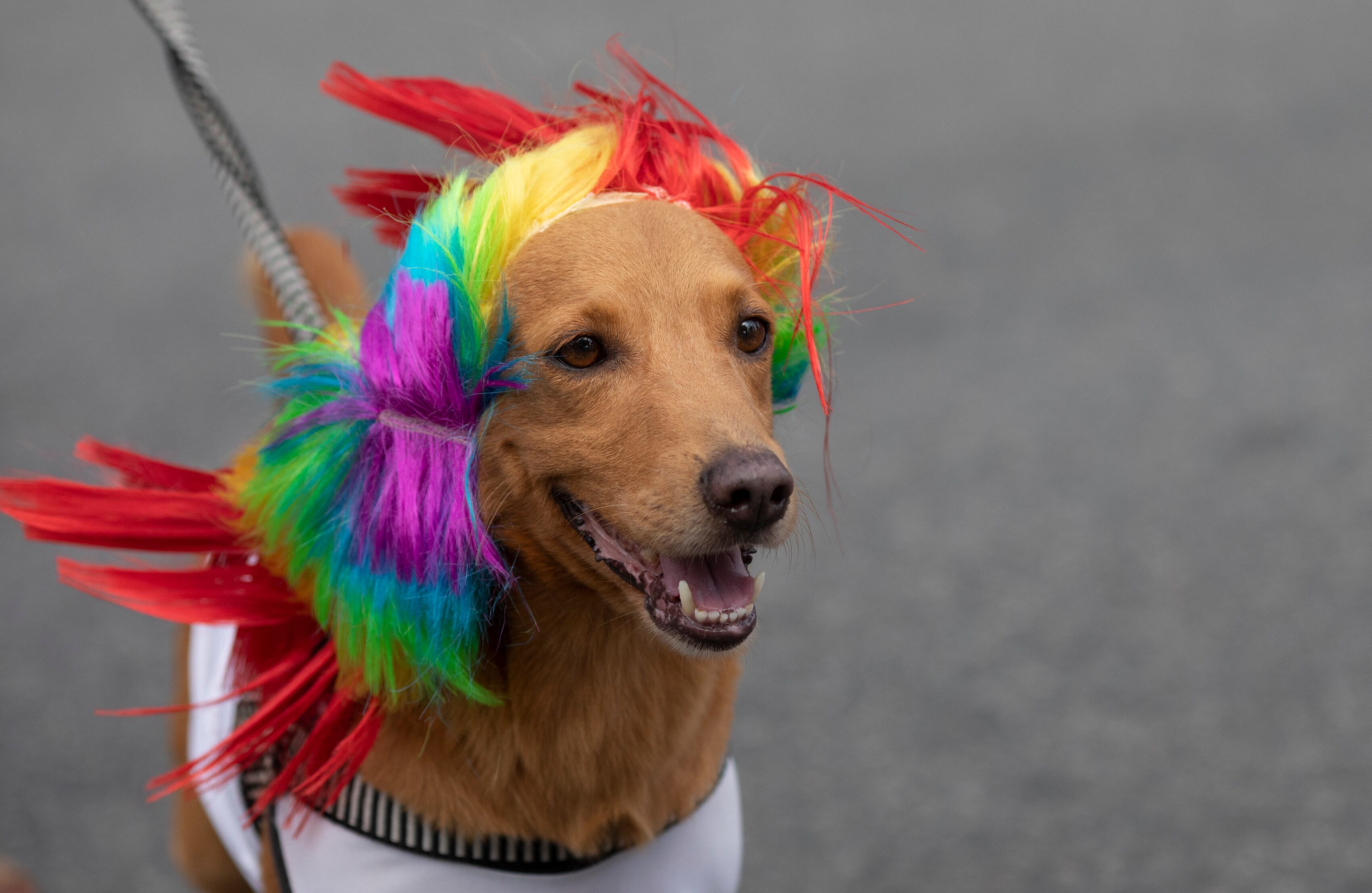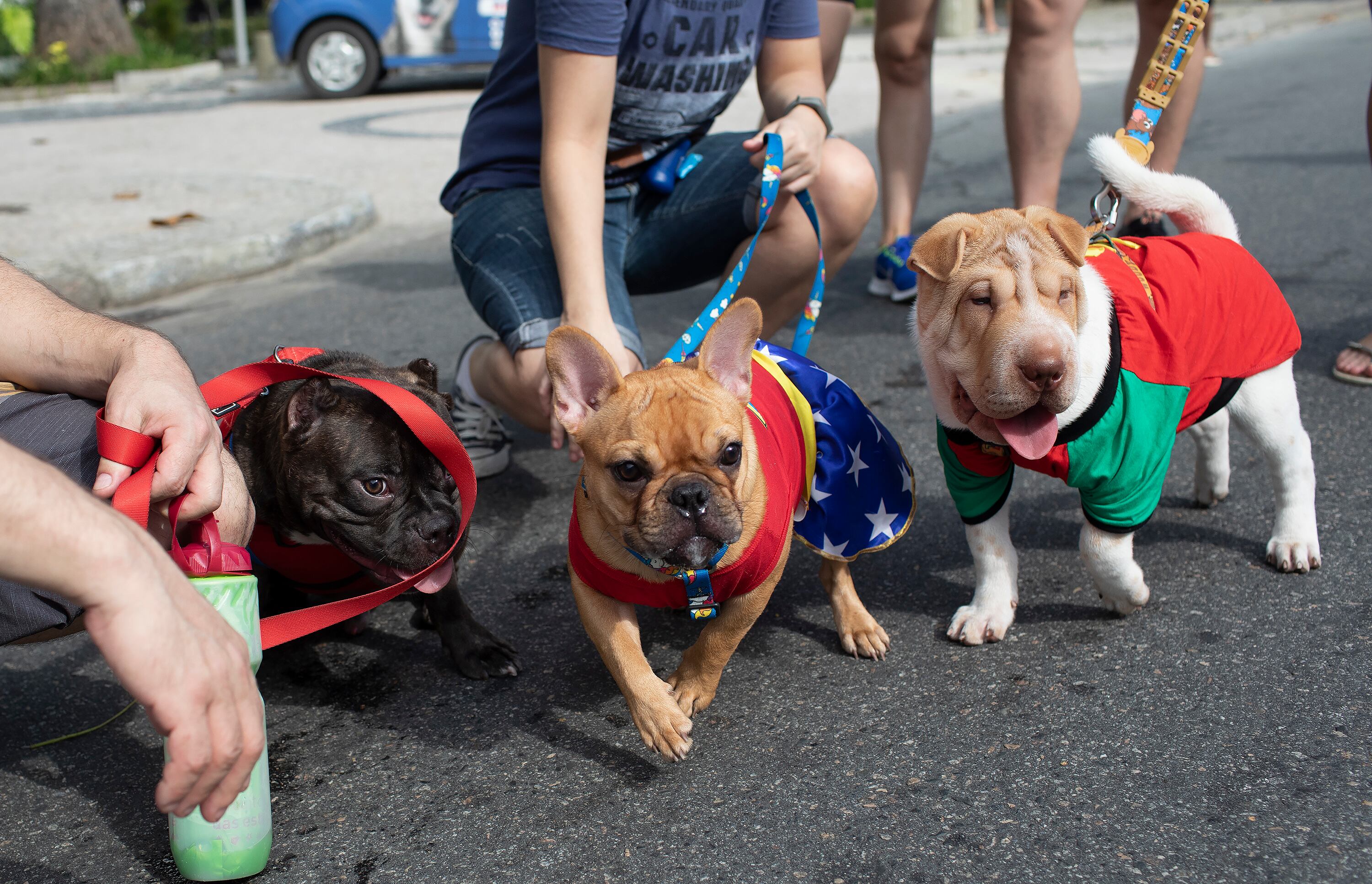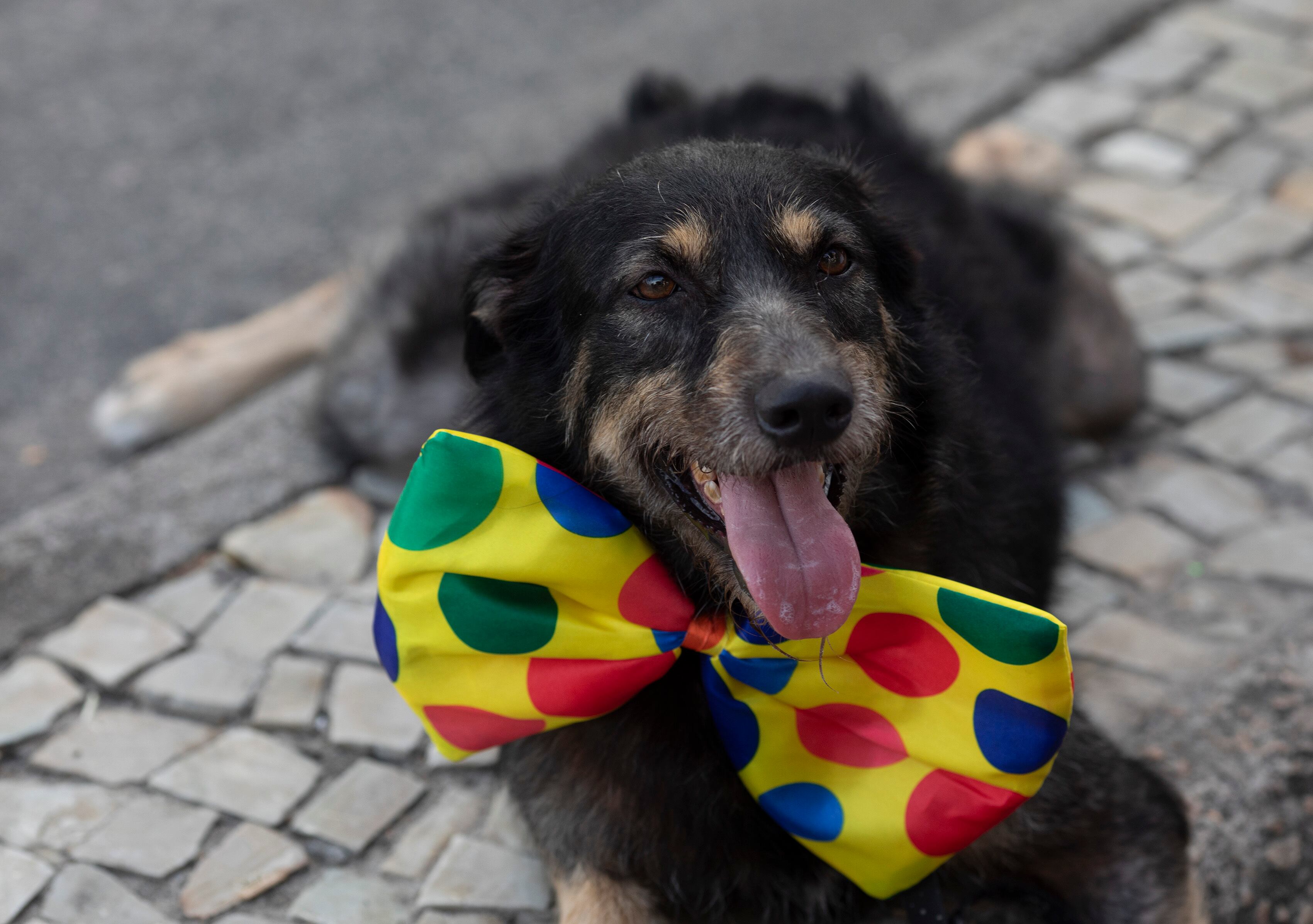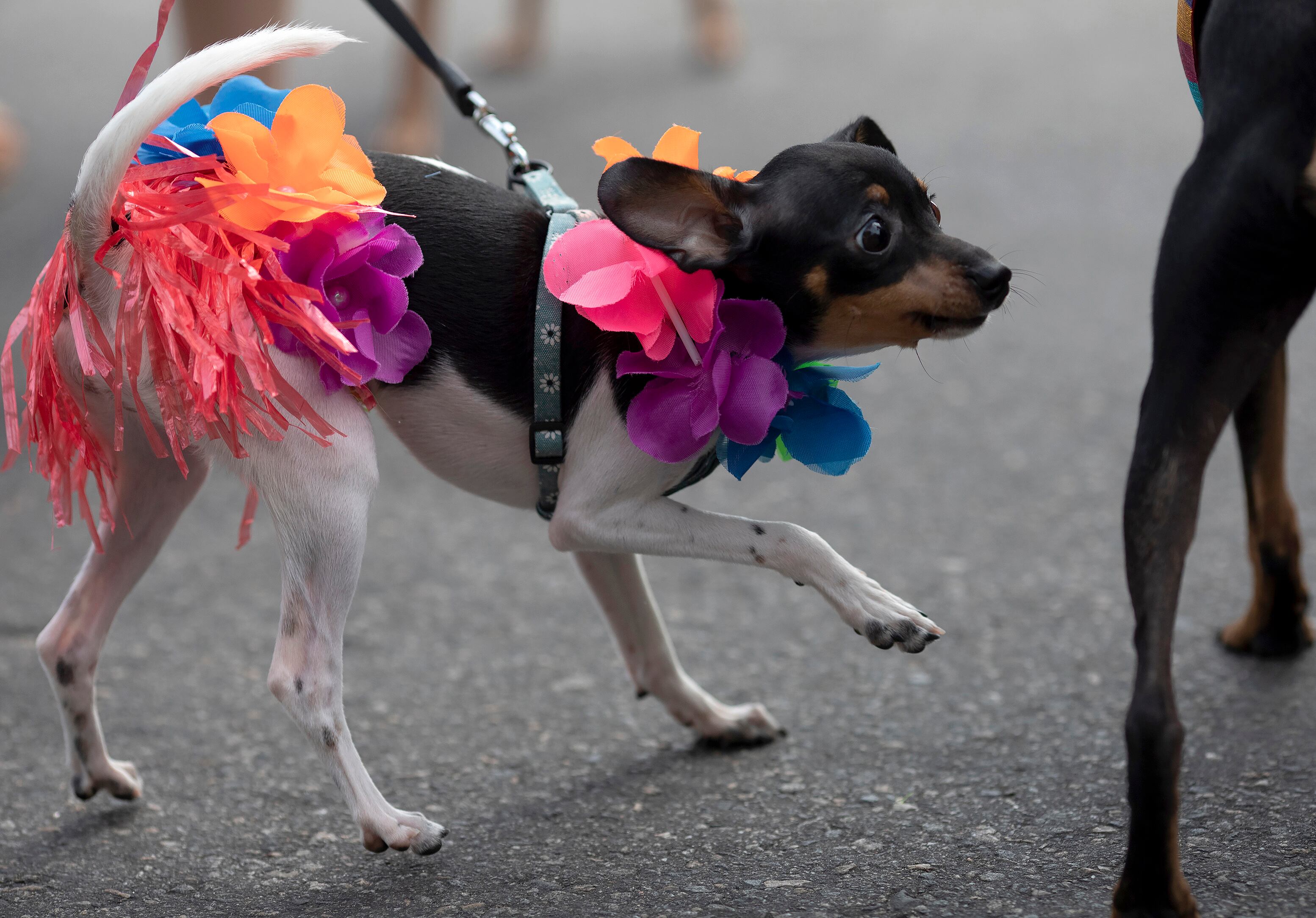 Decenas de perros disfrazados participaron el domingo del tradicional blocão, un desfile canino que se realiza cada año en el malecón de la playa de Copacabana.