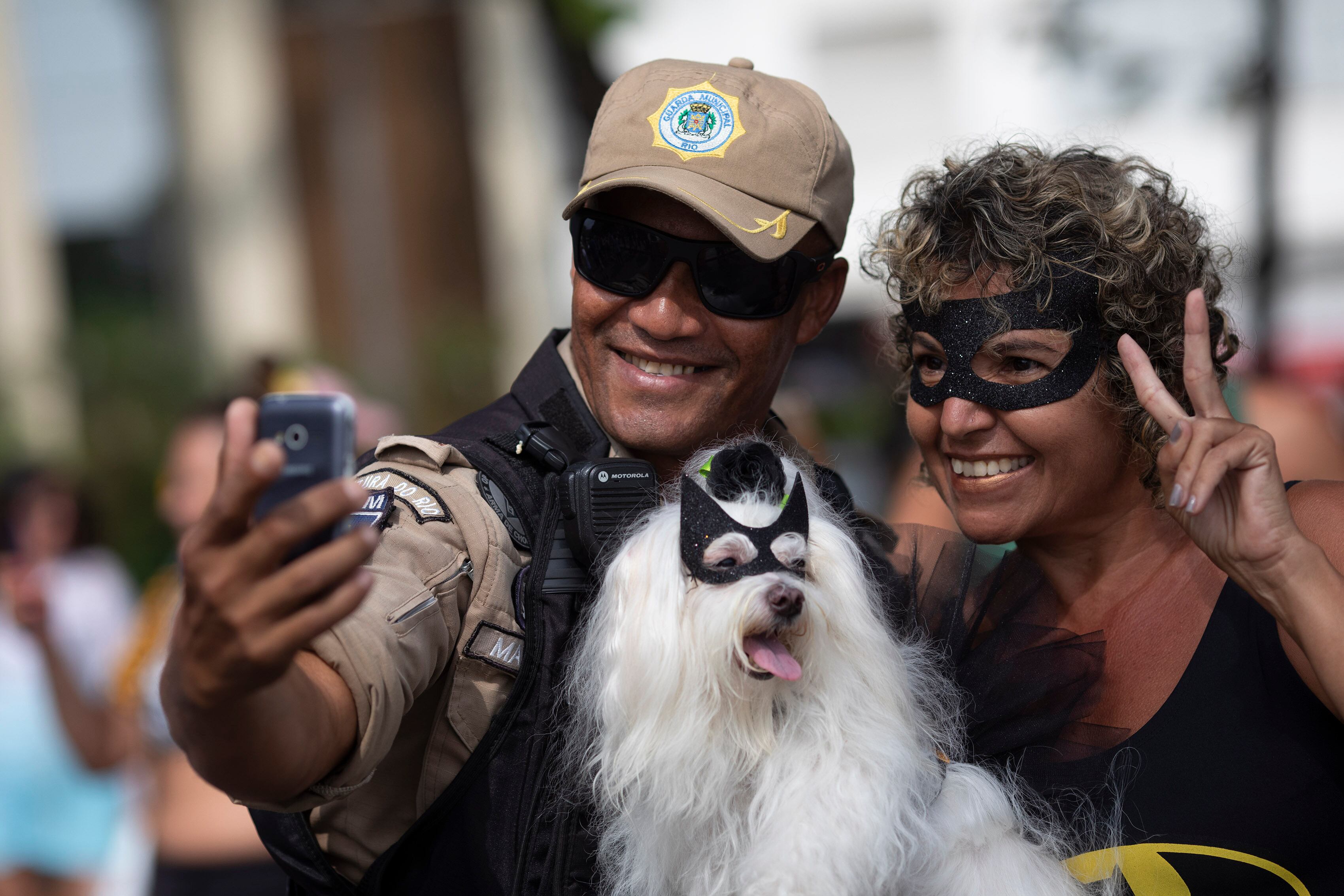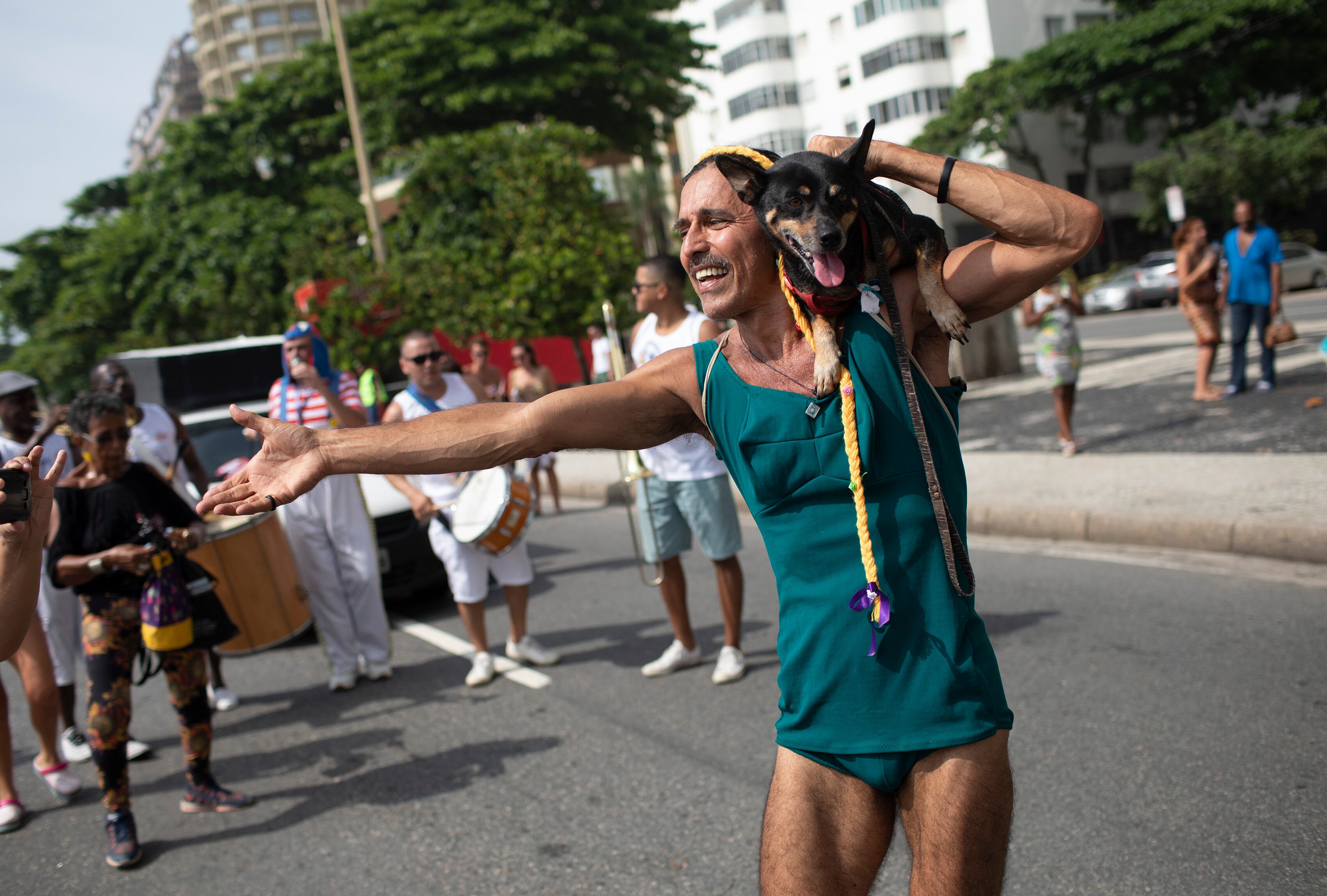 “Vamos a parar cuando la temperatura del asfalto sea muy alta y le pueda hacer mal a las patitas de nuestros perros”, advirtió Marco Antonio Toto, quien desde hace 17 años organiza el carnaval canino, mientras la camioneta con sonido avanzaba lentamente por la avenida Atlántica de Copacabana.