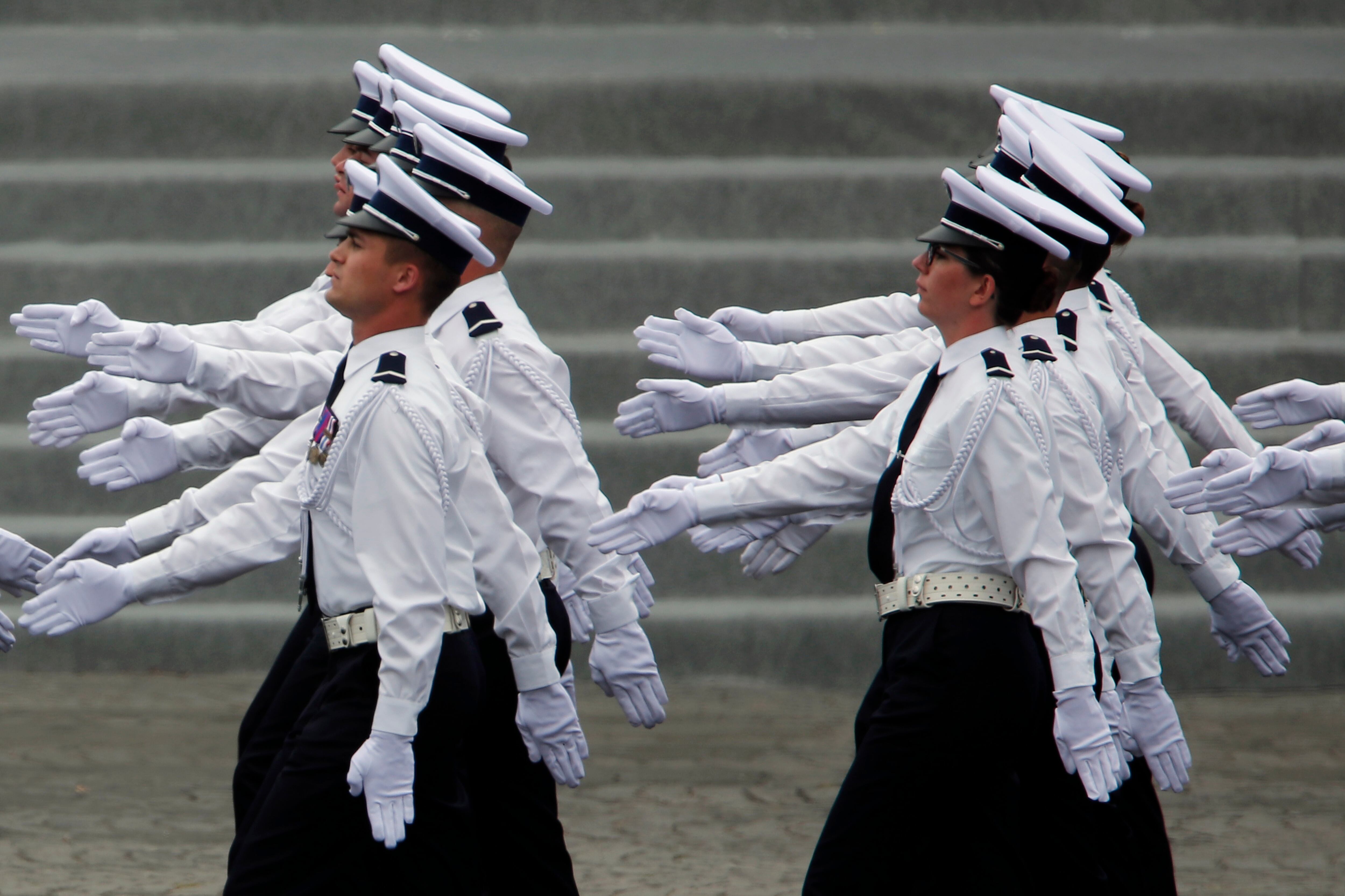 En el acto de este martes, los aviones de combate que pintaron el cielo con humo azul, blanco y rojo volaron acompañados de los helicópteros que transportaron a pacientes de COVID-19 graves. Una banda militar cantó el himno nacional, la Marsellesa, ante 2.000 invitados especiales.